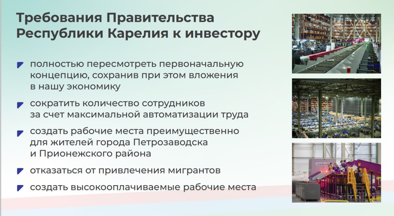 Глава Карелии прямо заявил: «Никто не собирается рассматривать проект с несколькими тысячами мигрантов». Власти приняли решение отменить распоряжение о выделении земельного участка под строительство по проекту, предложенному Wildberries