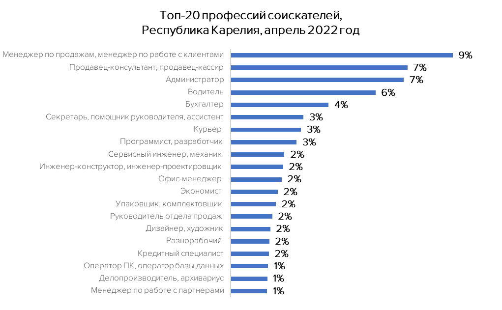 Судя по активности кандидатов больше всего в Карелии нуждаются в новой работе и подработке соискатели, имеющие профессию, связанную с продажами, администраторы, водители, бухгалтеры, секретари, курьеры, программисты и другие. Подробнее — на диаграмме ниже.