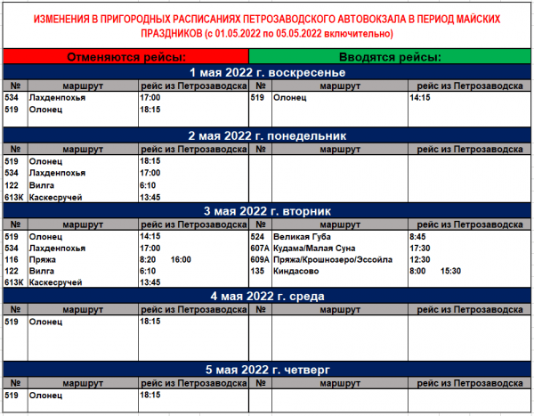 Отменены автобусы в Лахденпохью, Олонец, Вилгу, Пряжу, Каскесручей. Введены рейсы в Кудаму, Великую Губу, Пряжу, Киндасово. Воскресный рейс в Олонец перенесли на более раннее время.