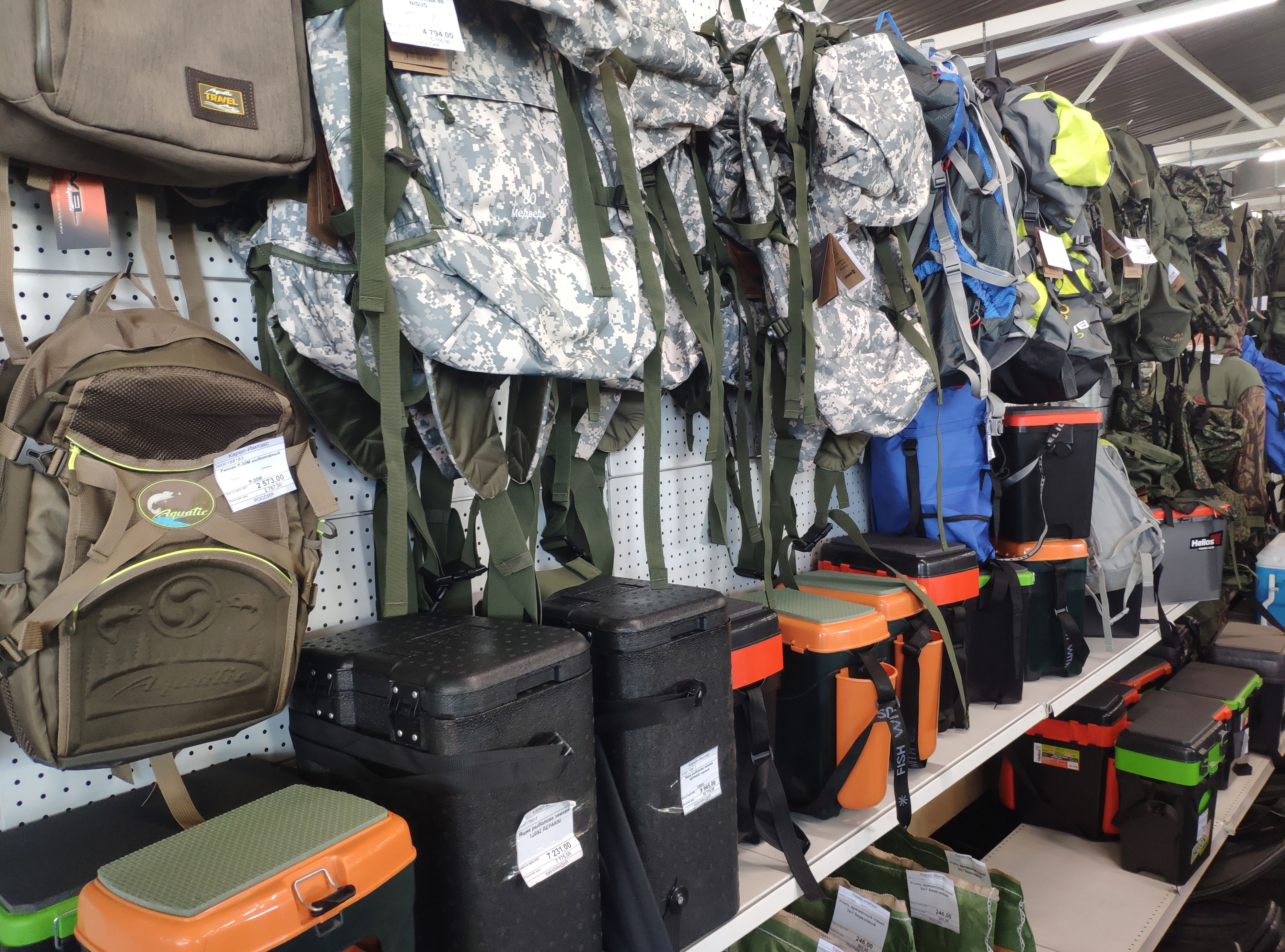 С обувью та же история. Представлены все виды сапог – от коротких из ПВХ или ЭВА до полукомбинезонов и вейдерсов Alaskan для пеших походов по рекам с нахлыстом или спиннингом. Все бренды российские, проверенные и доступные по цене. А для того, что идти в поход здесь подберут и подходящий рюкзак. Тоже отечественного производства.