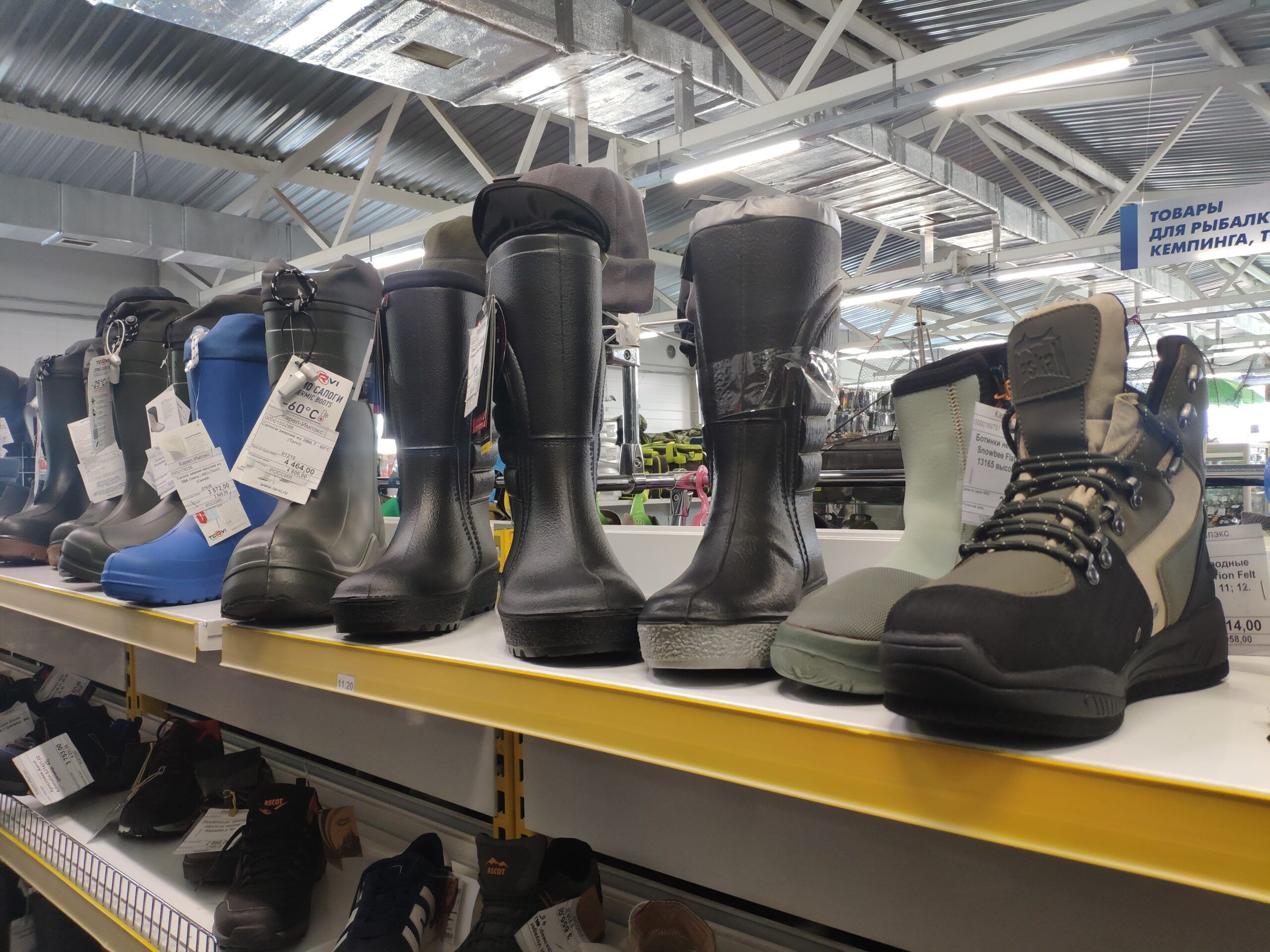 С обувью та же история. Представлены все виды сапог – от коротких из ПВХ или ЭВА до полукомбинезонов и вейдерсов Alaskan для пеших походов по рекам с нахлыстом или спиннингом. Все бренды российские, проверенные и доступные по цене. А для того, что идти в поход здесь подберут и подходящий рюкзак. Тоже отечественного производства.