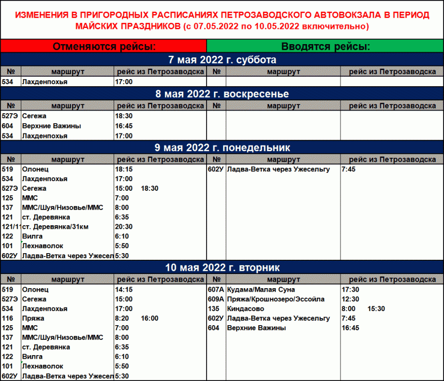 7 мая отменят всего один рейс, 8-го – три. Основные изменения коснутся 9 и 10 мая. За четыре дня отменят 26 рейсов, введут шесть новых.
