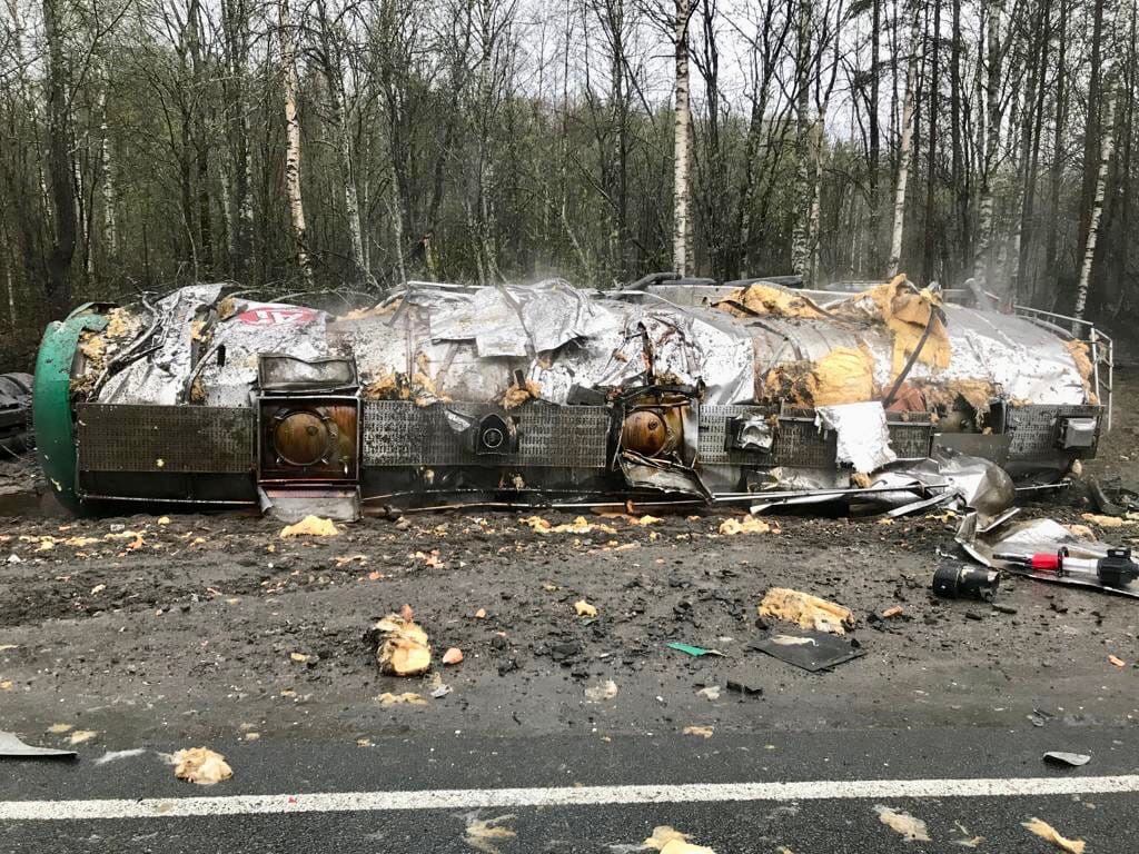 ДТП произошло еще 13 мая. Напомним, 39-летний водитель грузовой автомашины «Вольво» с полуприцепом, из-за взрыва правого заднего колеса, допустил неуправляемый занос транспортного средства около деревни Половина. В результате произошло столкновение с автомобилем «Шкода». Оба транспортных средства съехали в кювет. В ДТП травмирован водитель «Вольво». При этом пролилась жидкость из цистерны. В некоторых СМИ появилась информация об экологической катастрофе в связи с этим.