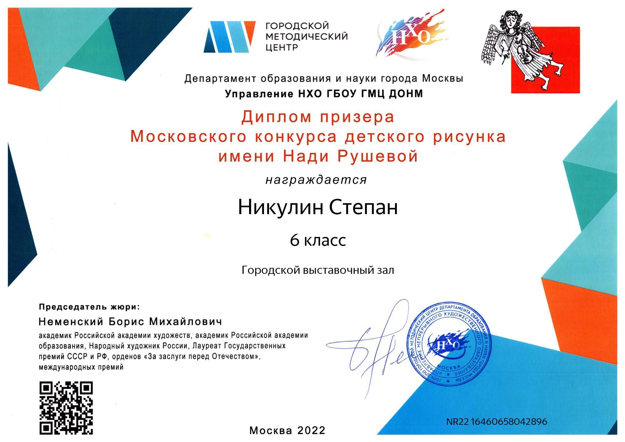 Шестиклассник из Петрозаводска попал в число призёров московского конкурса имени Нади Рушевой. «До победителя не дотянули, но уровень достойный», — написала у себя на странице в ВК педагог Степы Никулина Майя Савчук. Диплом с подписью Б.М.Неменского — это диплом с подписью корифея детского художественного образования в России.