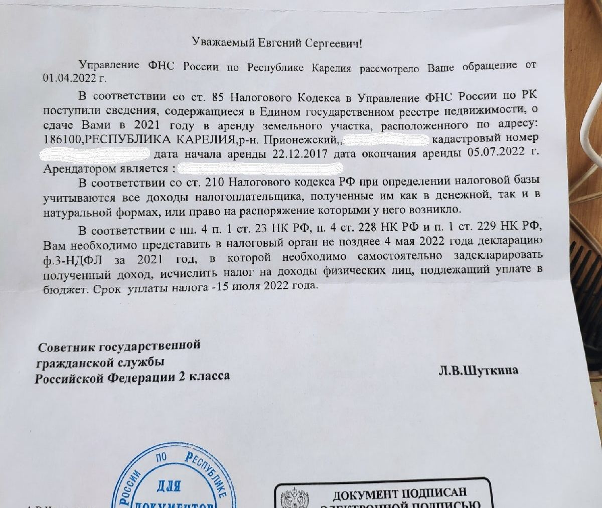 И вот на днях получаю очередной ответ от советника государственной гражданской службы 2 класса Л.В.Шуткиной (еще более символично!). И там вполне себе нешуточный ответ, что я все-таки должен сдать декларацию, поскольку, по их данным, аж с 2017 года сдаю в аренду этот самый земельный участок. Срок аренды заканчивается в июле 2022 года. В любом случае, доход с аренды я получал, так что давай плати налоги и декларируй сделку. Указаны даже ФИО арендатора. Им оказался человек, у которого я в 2019 году и приобрел в собственность этот самый участок. Иными словами, в налоговой уверены, что с 2017 года я сдаю в аренду участок, на котором проживаю, человеку, у которого я приобрел этот участок в 2019 году. Такая хитрая многоходовочка.