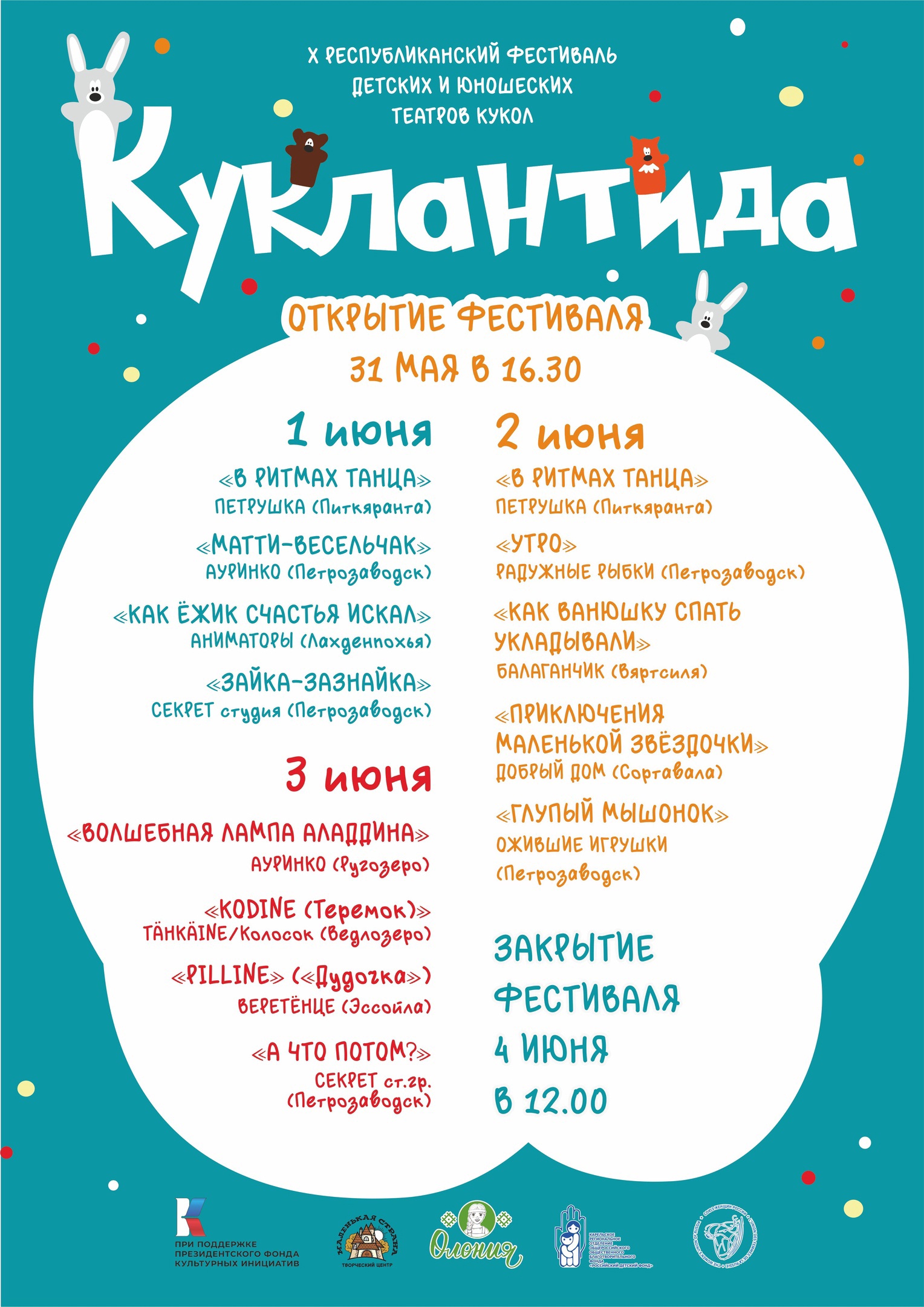 Из петрозаводских коллективов в фестивале примут участие Театр кукол и масок «Секрет» Центра образования и творчества «Петровский Дворец», театр «Ожившие игрушки» и театральные коллективы детских садов № 22 и № 34. Всего в афише Х Республиканского фестиваля детских и юношеских театров кукол «Куклантида» 13 спектаклей.