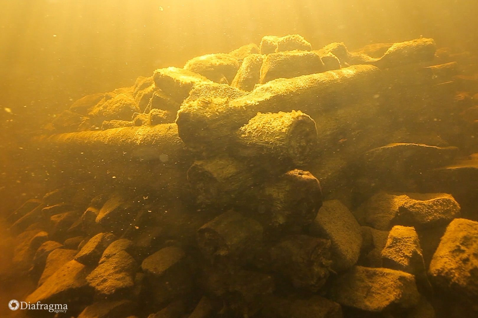На дне можно увидеть основания из сруба, заполненные камнем. Примечательно, что холодная вода озера практически не разрушает дерево. С помощью подводного металлоискателя осмотрели пристани и обнаружили якорь. Находка подтверждает, что тут останавливались корабли, говорят дайверы.