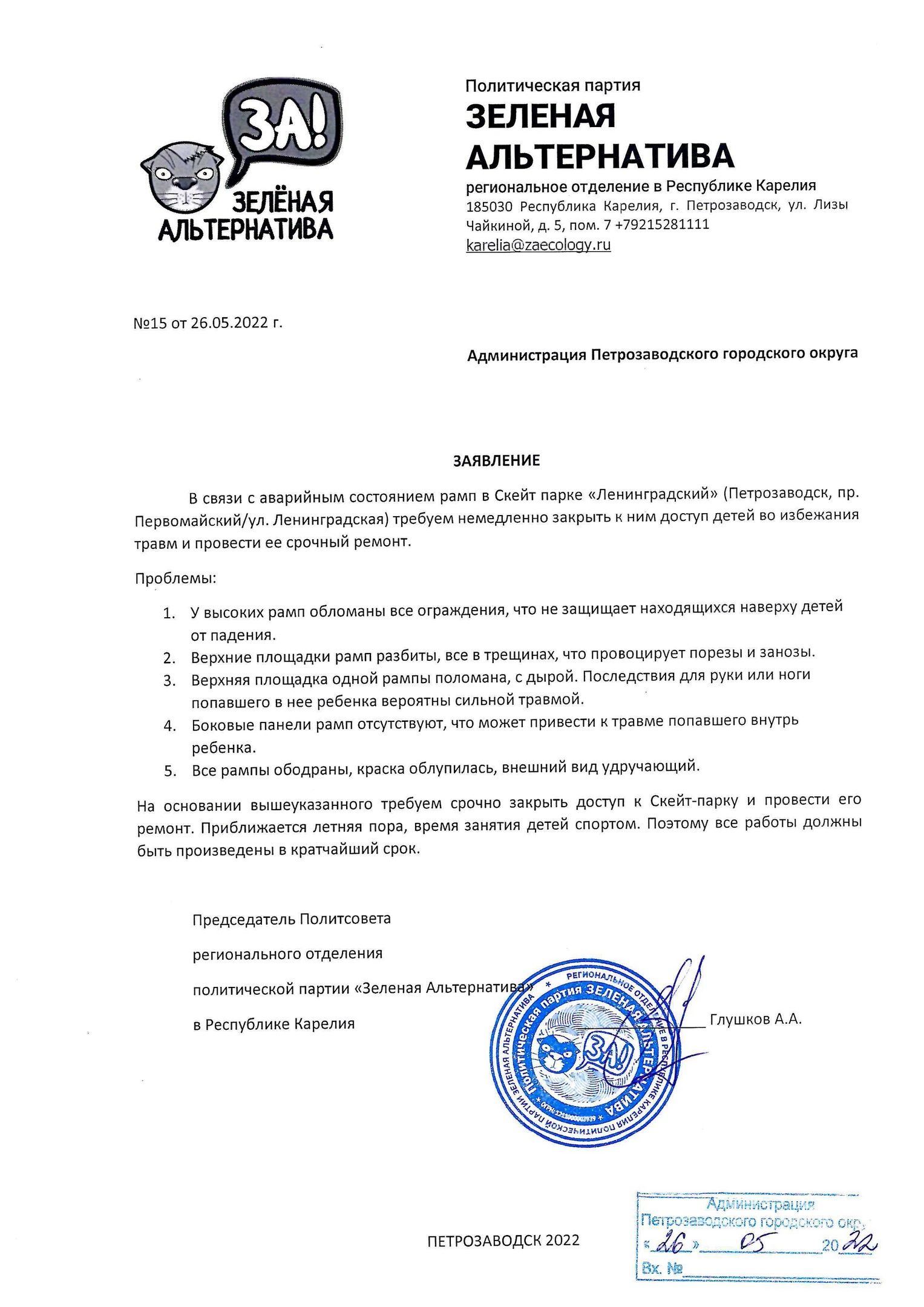 От лица «Зеленой альтернативы» Алексей Глушков написал обращение в администрацию Петрозаводского городского округа с требованием немедленно закрыть доступ к травмоопасным рампам и срочно произвести их ремонт.