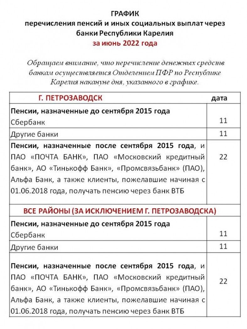 Карельское отделение Пенсионного фонда опубликовало график перечисления пенсий и других социальных выплат в июне.