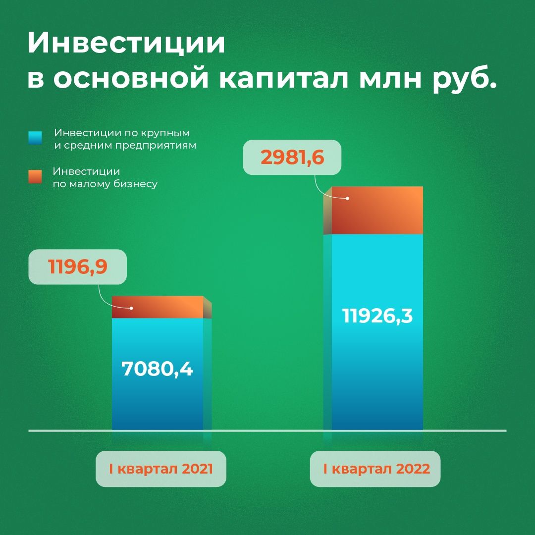 При росте инвестиционных вложений в прошлом году на 21% в январе-марте 2022 года инвестиции в основной капитал составили почти 15 млрд рублей, что в 1,6 раза выше аналогичного периода прошлого года в сопоставимых ценах.