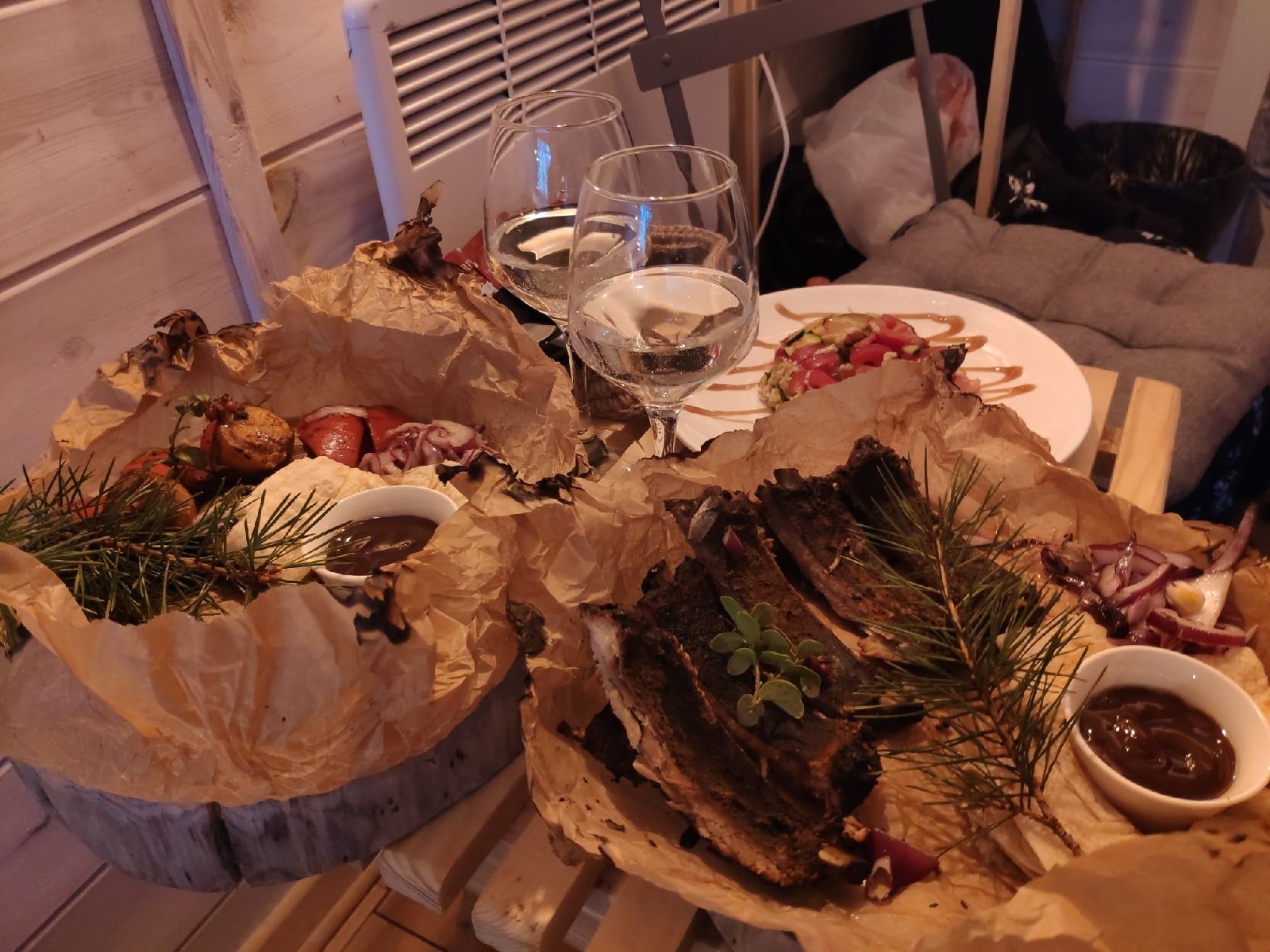 Вечером к нам в домик постучали. Это шеф-повар ресторана приготовил и принес знаменитое мясо, приготовленное на смокере. Сервировка – в лесном стиле, в стиле New Camp. Тот самый антураж Карелии. А запах!