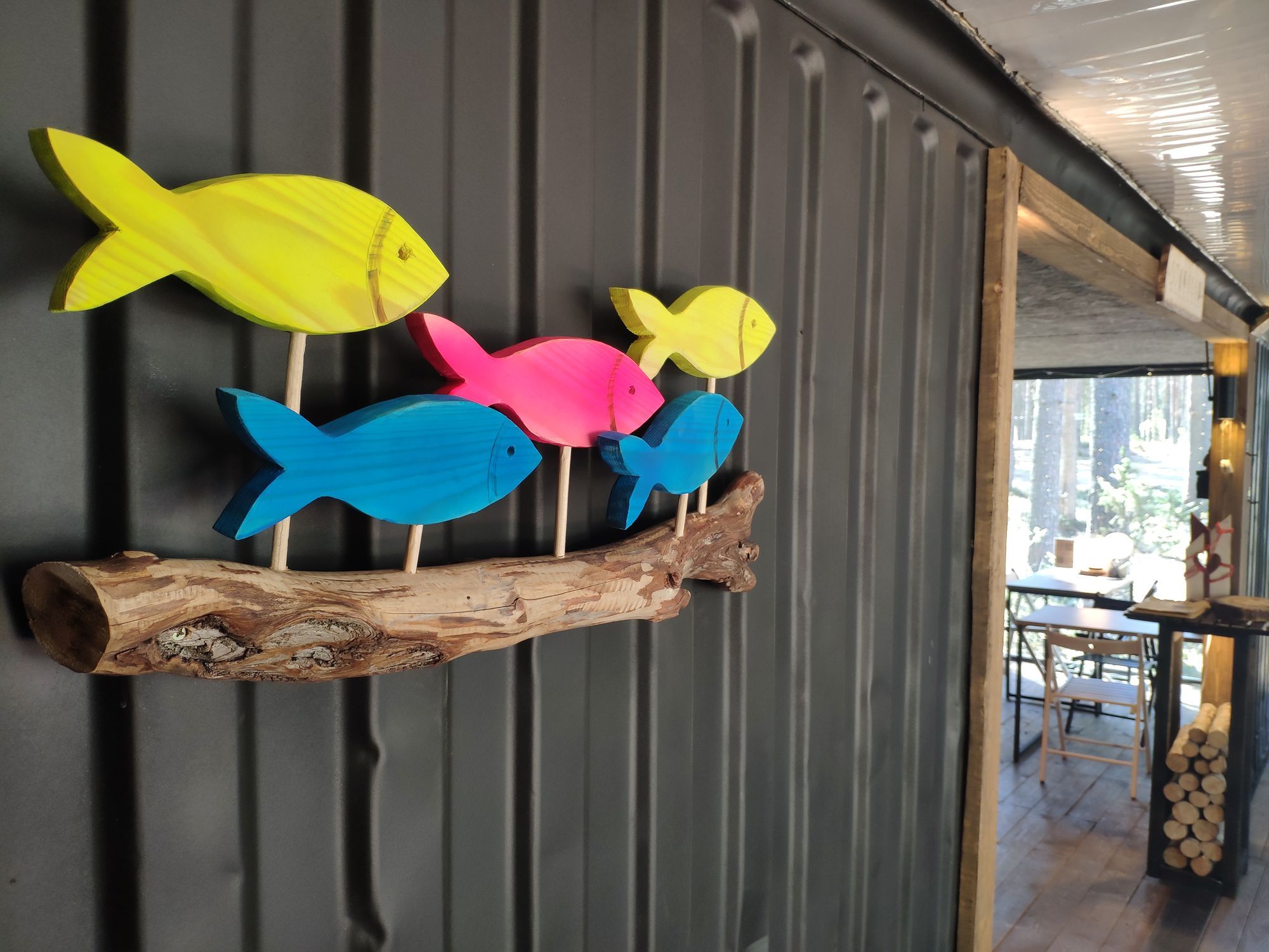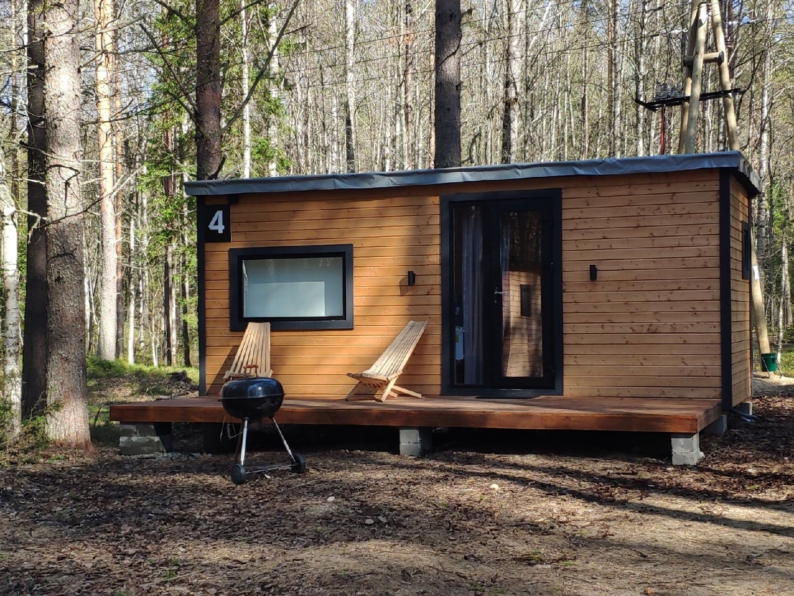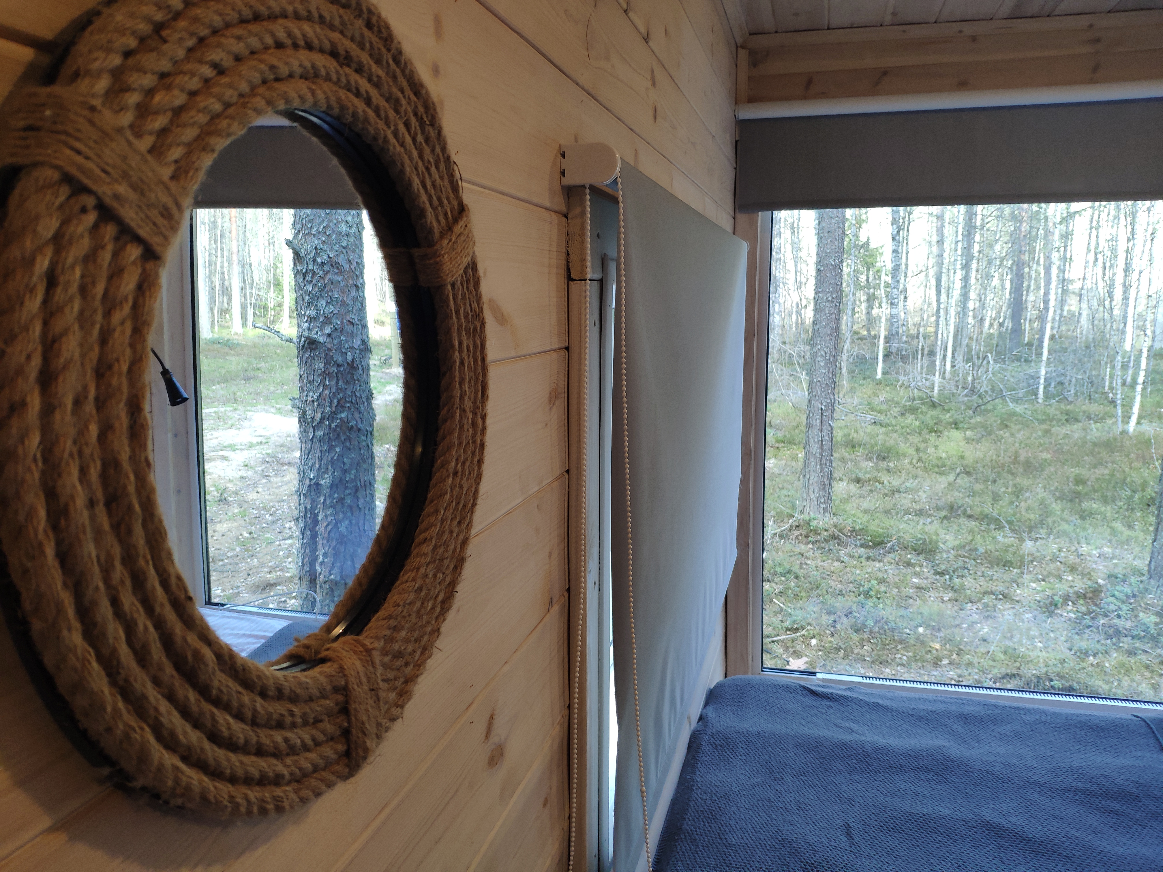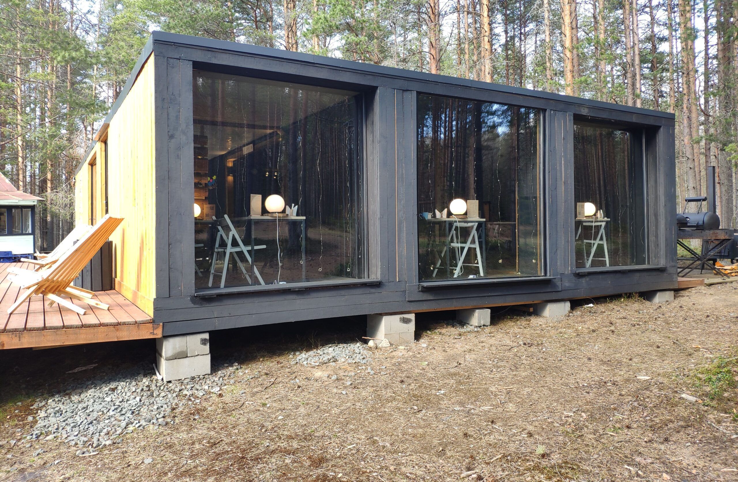 Маленькие домики, почти вагончики – модные, симпатичные, на строительные бытовки похожие только размером. Четыре стены, одна их которых представляет собой окно с видом на лес. Классная веранда с креслами.