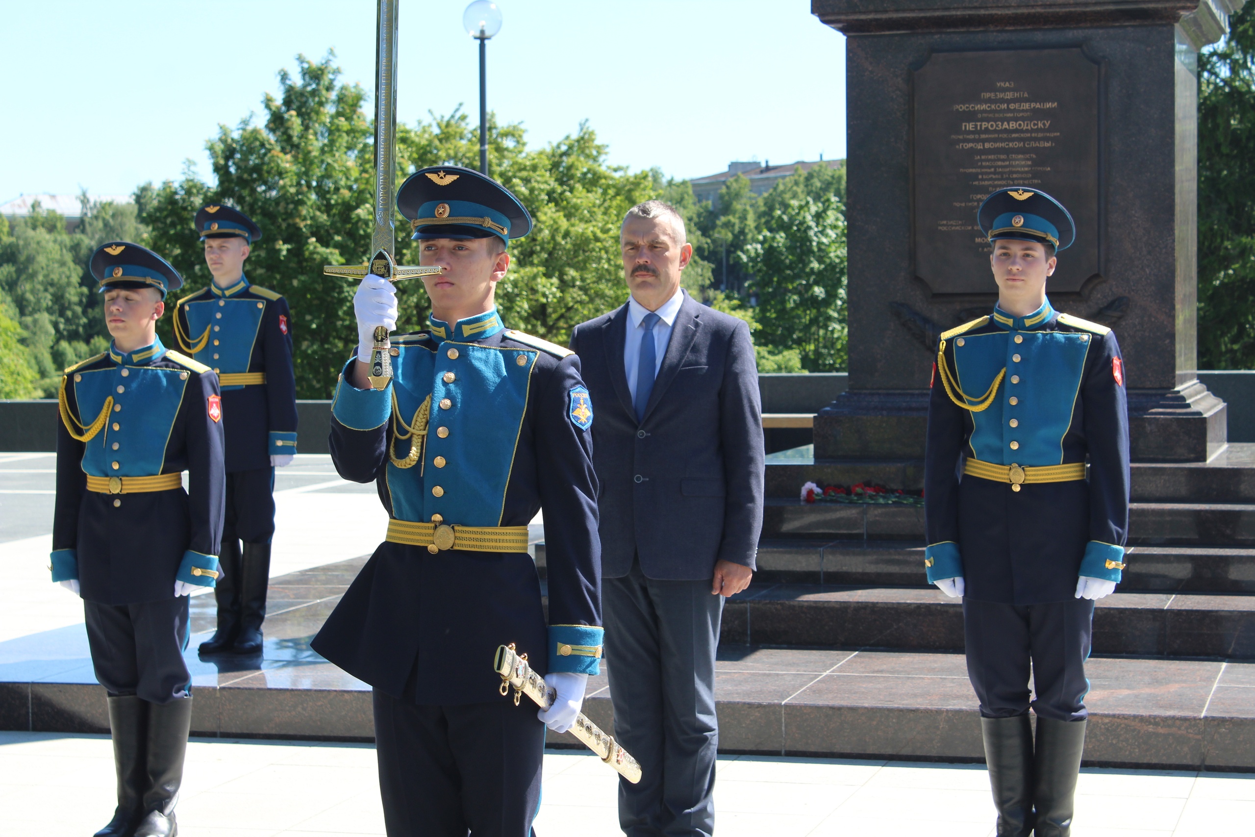 Торжественная церемония передачи Меча Победы, символизирующего вклад карельской столицы и его жителей в победу в Великой Отечественной войне, состоялась сегодня у Стелы воинской славы.