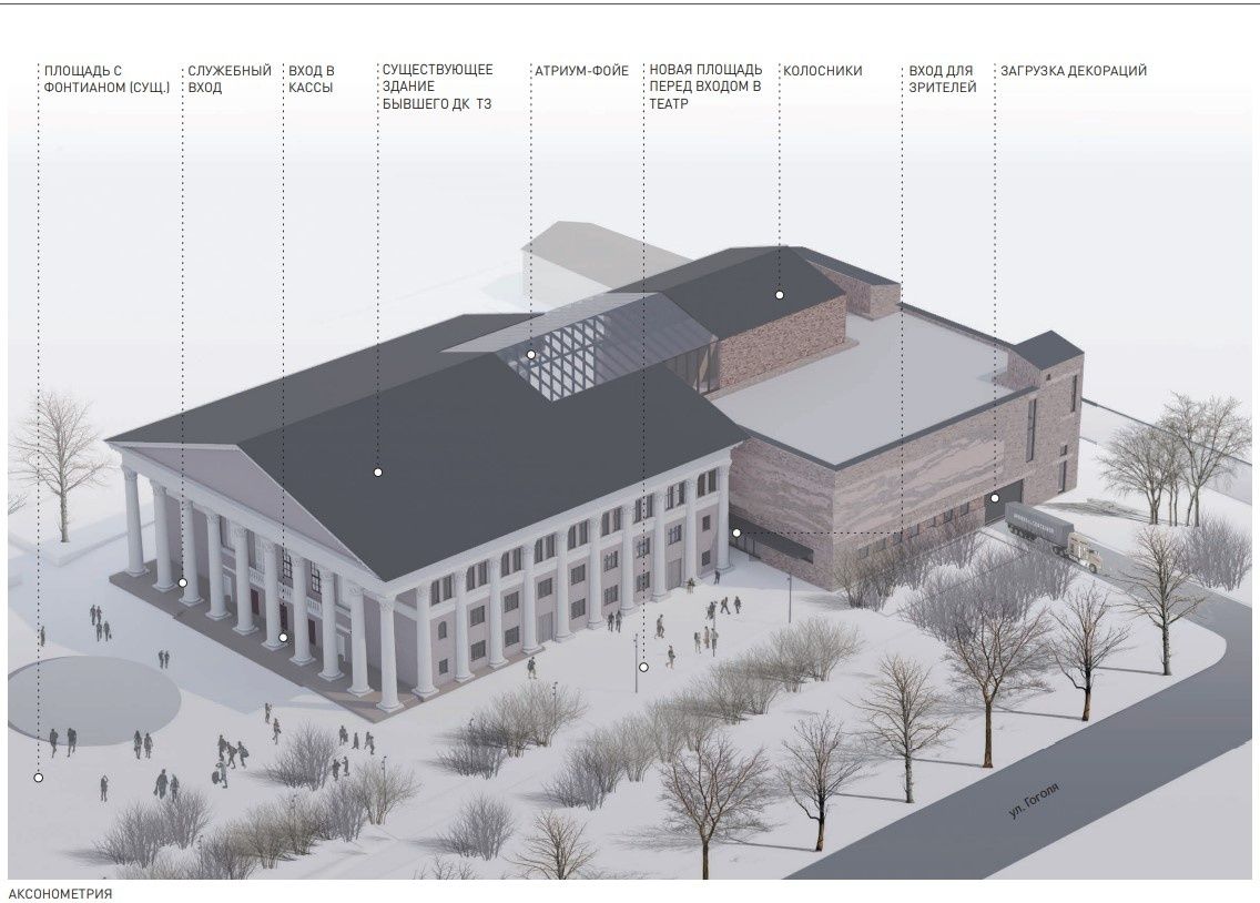 Подрядчик, компания «Строй-Эксперт» предлагает сохранить исторический объем здания и вид на него со стороны главного фасада. Новую сцену театра хотят пристроить с заднего фасада, сбоку, вдоль ул.Гоголя. Между историческим фасадом и новой сценой будет новый вход в театр.