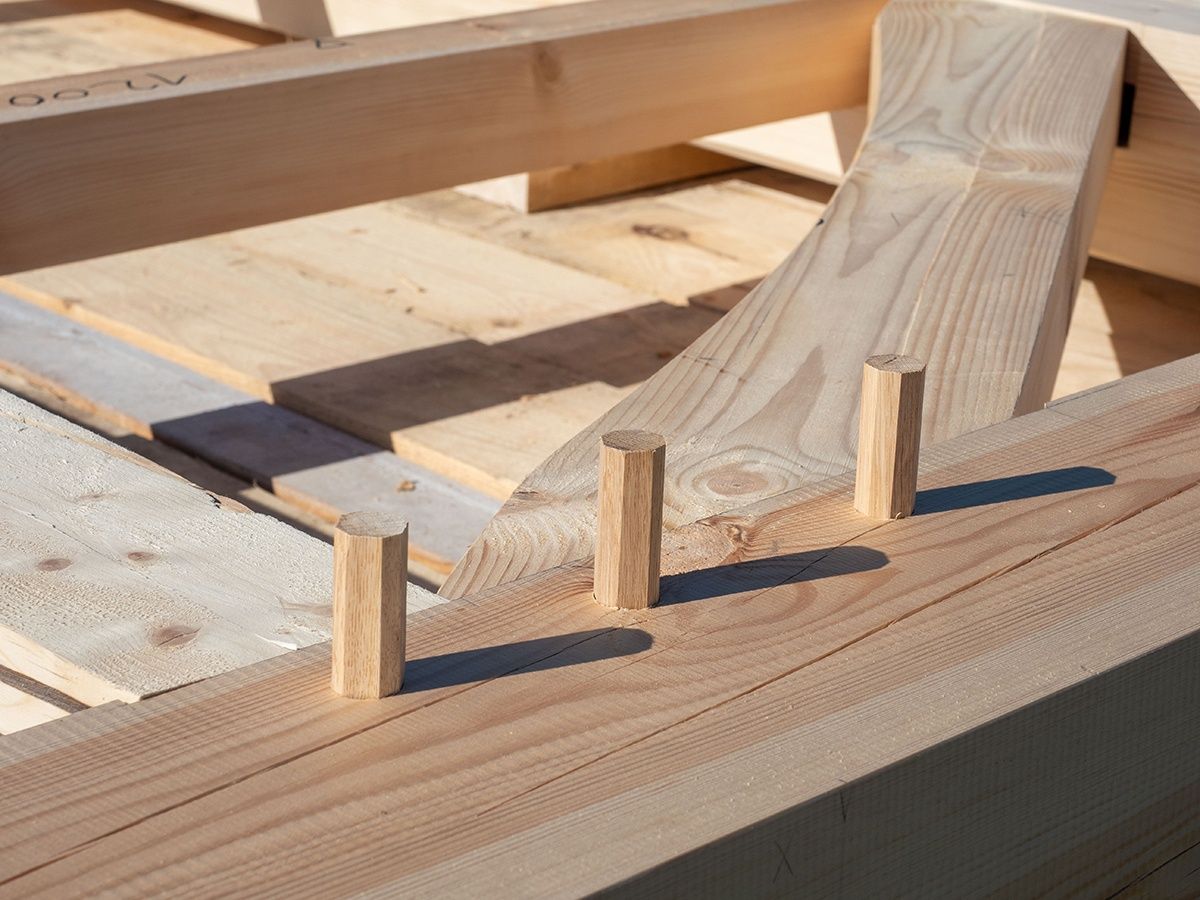Отверстия под нагели подходят с точностью до миллиметра. Во всём каркасе в процессе сборки строители ни разу ничего не переделывали. Несколько раз стамеской подтесали шипы, — восхищается фотограф.