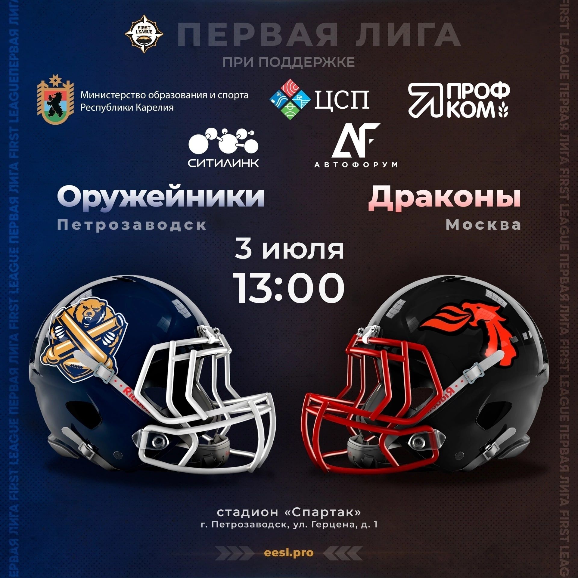 В воскресенье на стадионе «Спартак» состоится матч по американскому футболу между «Оружейниками» из Петрозаводска и «Драконами» из Москвы. Это уже вторая игра с соперником. Первая состоялась в Москве 9 мая. Тогда наша команда обыграла со счетом 30:10.