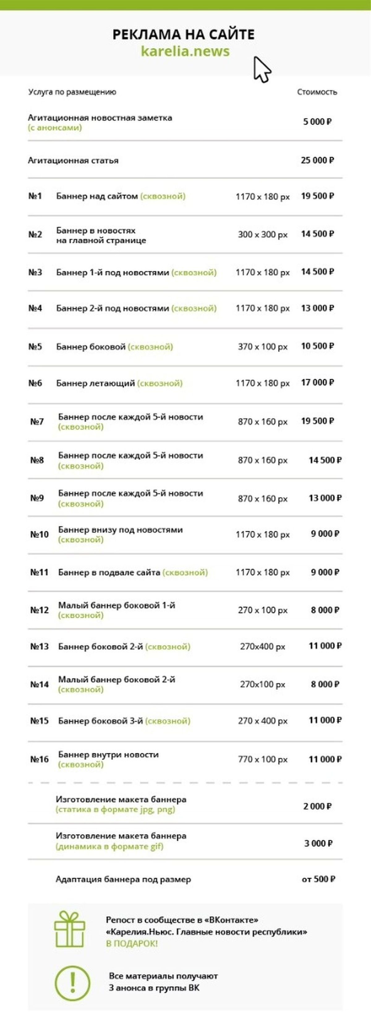 Общество с ограниченной ответственностью ««Информационно-рекламное агентство «Карелия.Ньюс»» публикует расценки (в валюте Российской Федерации) на услуги по подготовке и размещению агитационных материалов в информационно-телекоммуникационной сети «Интернет» — на сайте «Карелия.Ньюс» https://karelia.news на выборах главы Республики Карелия, назначенных на 11 сентября 2022 года.