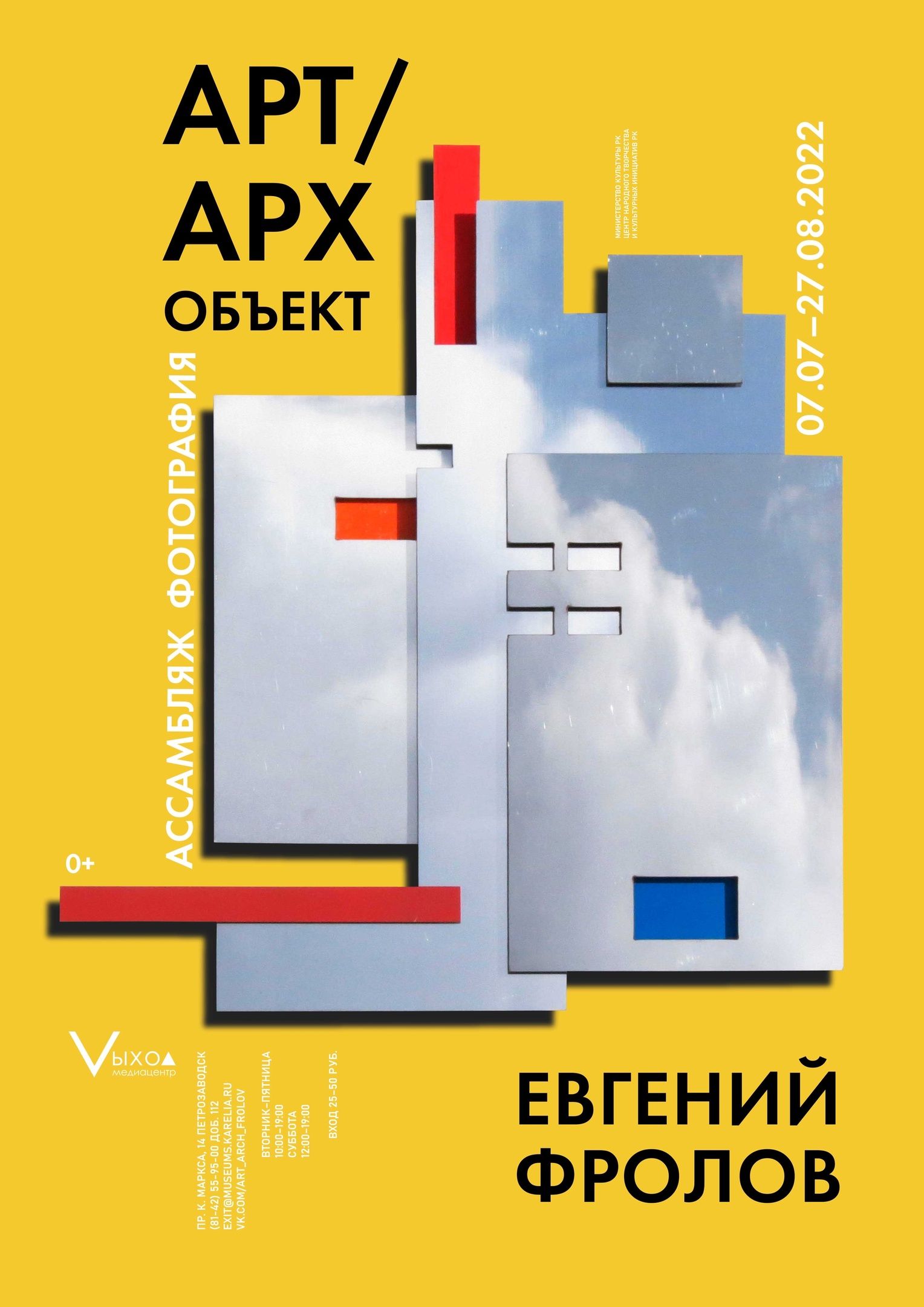 7 июля в медиацентре «Vыход» в Петрозаводске откроется выставка «АРТ/АРХ объект» известного карельского архитектора, бывшего главного архитектора карельской столицы Евгения Фролова. Выставка состоит из 25 объёмных композиций, выполненных в различных материалах от цветной резины до полированного металла. Цветные фотографии зданий, построенных по проектам автора, и их архитектурных деталей, дополняют экспозицию.