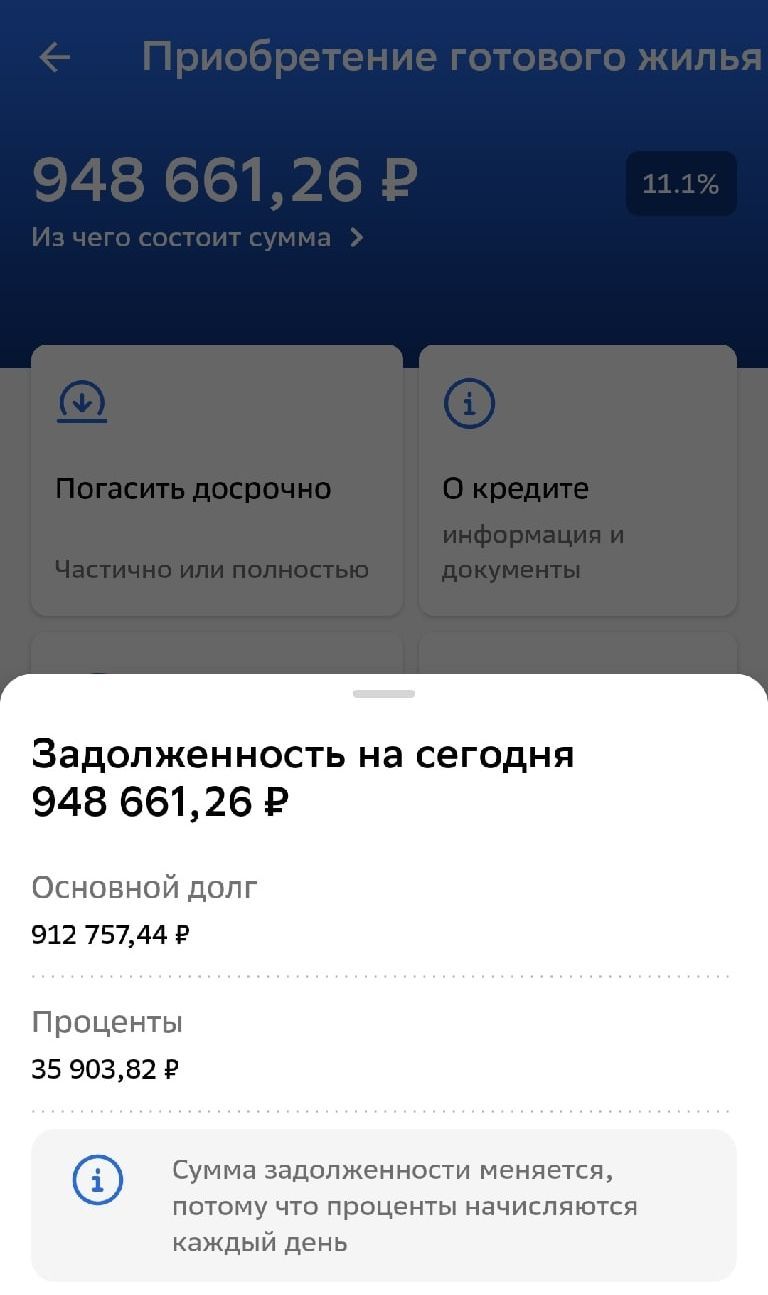 Я успокоился и забыл про ипотеку, полагая, что осенью вернусь к ней. Но сейчас, в июле, я решил проверить в приложении – все ли в порядке, нет ли сюрпризов. И к своему удивлению увидел, что мой долг составляет уже 948 тысяч рублей. Вот так заморозка!