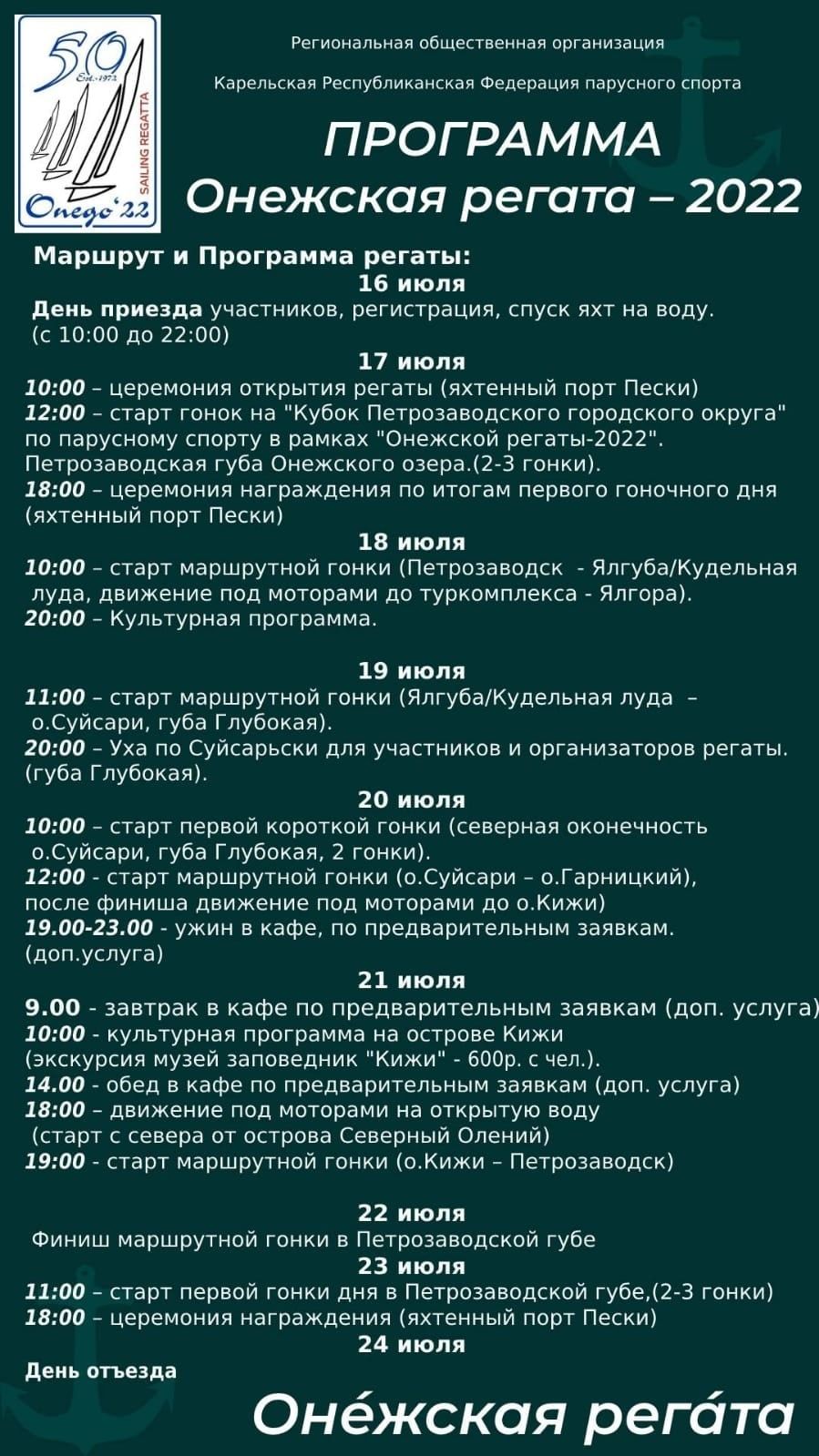 В карельской столице в Яхтенном порту Пески 17 июля в 10:00 состоится торжественное открытие «Онежской регаты», которая в этом году отмечает свое 50-летие. В этот же день пройдут первые гонки за Кубок Петрозаводского городского округа по парусному спорту.