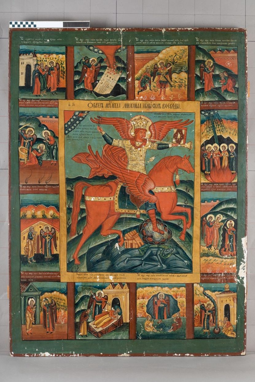 Был удален потемневший слой олифы, а также поверхностные и стойкие загрязнения, восполнены утраты авторского левкаса, укреплен красочный слой иконы, заделана сквозная трещина с разрывом паволоки. И теперь мы можем увидеть во всем великолепии Архангела Михаила, изображенного древним иконописцем в облике предводителя небесного воинства — пламенного всадника с позолоченным венцом на голове и в воинских доспехах.