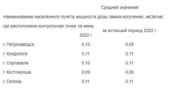 В Костомукше среднее значение мощности дозы гамма-излучения составляет 0,09 мкЗв/ч, в Петрозаводске и Сортавале — 0,10 мкЗв/ч. В Кондопоге и Сегеже значение мощности дозы гамма-излучения равно 0,11 мкЗв/ч.