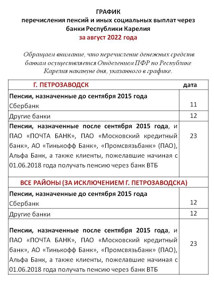 Жители районов Карелии, которым пенсии назначили до сентября 2015 года, выплата придет 12 августа. Те, кому пенсию назначили позже, а также те, кто перевел пенсию в ВТБ с 1 июня 2018 года, получат деньги 23 августа.