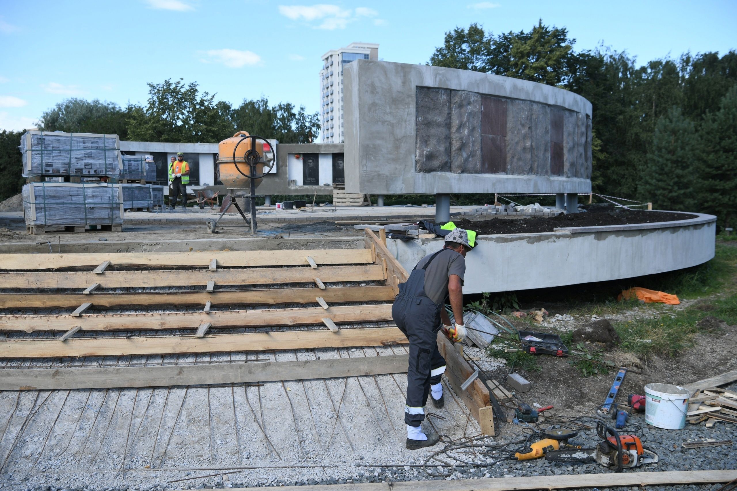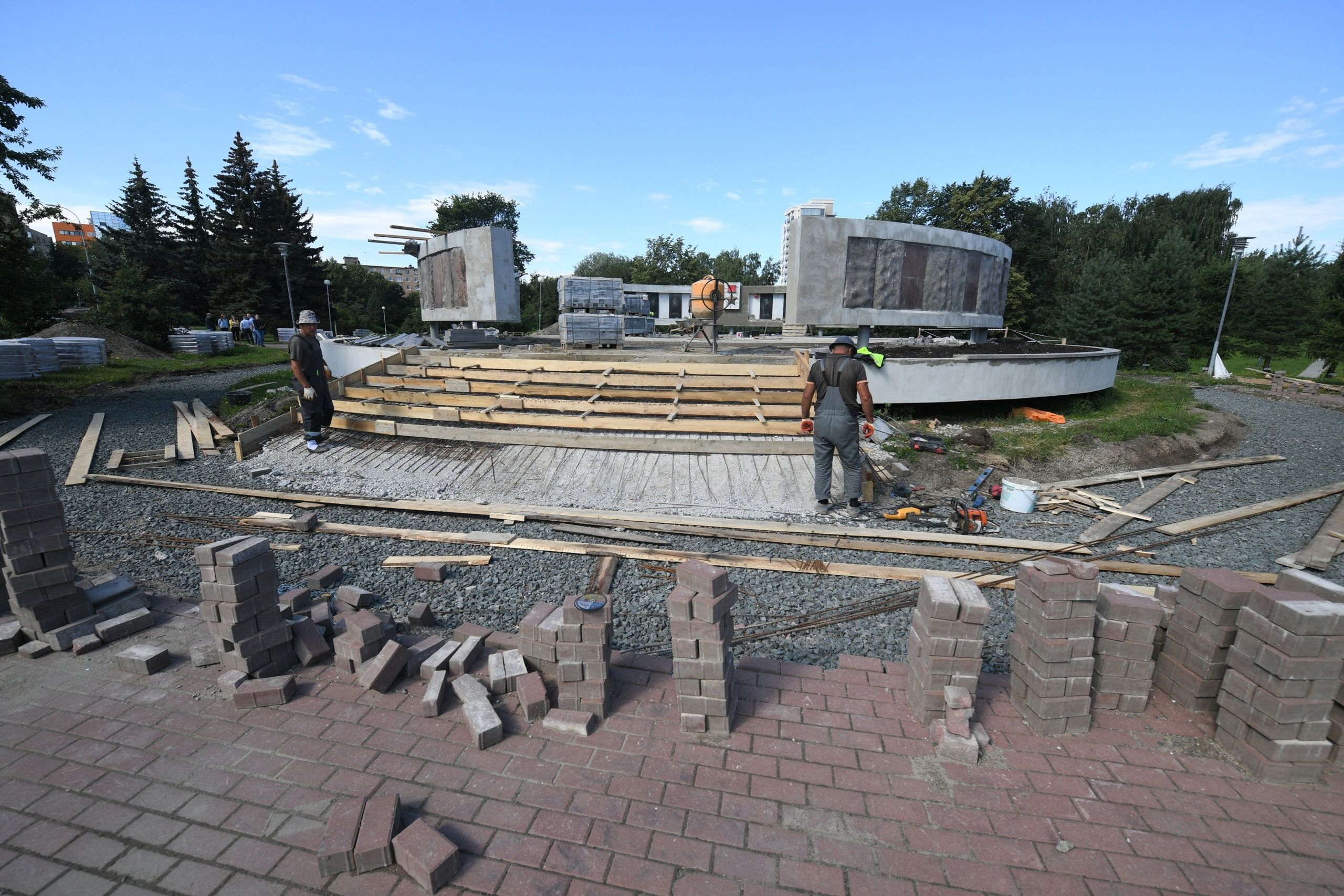 Ступени мемориала будут из дымовского гранита: износостойкость камня высокая, на века. Его подрядчик поставляет из Ленобласти. По контракту объект должен быть готов к 1 сентября. Сейчас строители занимаются мощением круглой площади и укладкой гранитных плит по всему радиусу галереи. Общая стоимость контракта составит порядка 23 млн рублей.