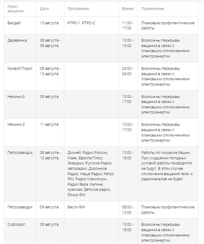 Опубликован график отключений и в других населенных пунктах республики. Вещание прервется в поселках Валдай, Деревянка, Кривой Порог, Софпорог, Немино-3.