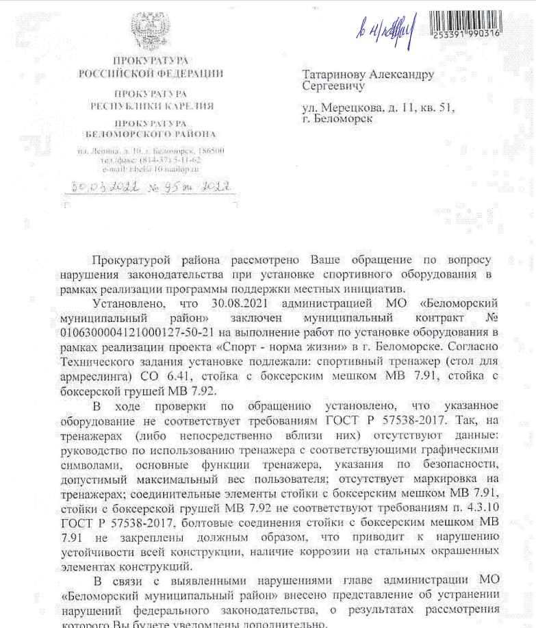 Также обнаружили коррозию на стальных элементах конструкции. При этом не было маркировки и руководства по использованию тренажеров. Оборудование не соответствует ГОСТу, посчитали в прокуратуре и внесли представление главе администрации Беломорского района устранить нарушения. Однако, это сделано не было. Чиновники решили провести экспертизу оборудования и вот теперь уже нанятые эксперты выявили дефекты, которые не подлежат устранению.