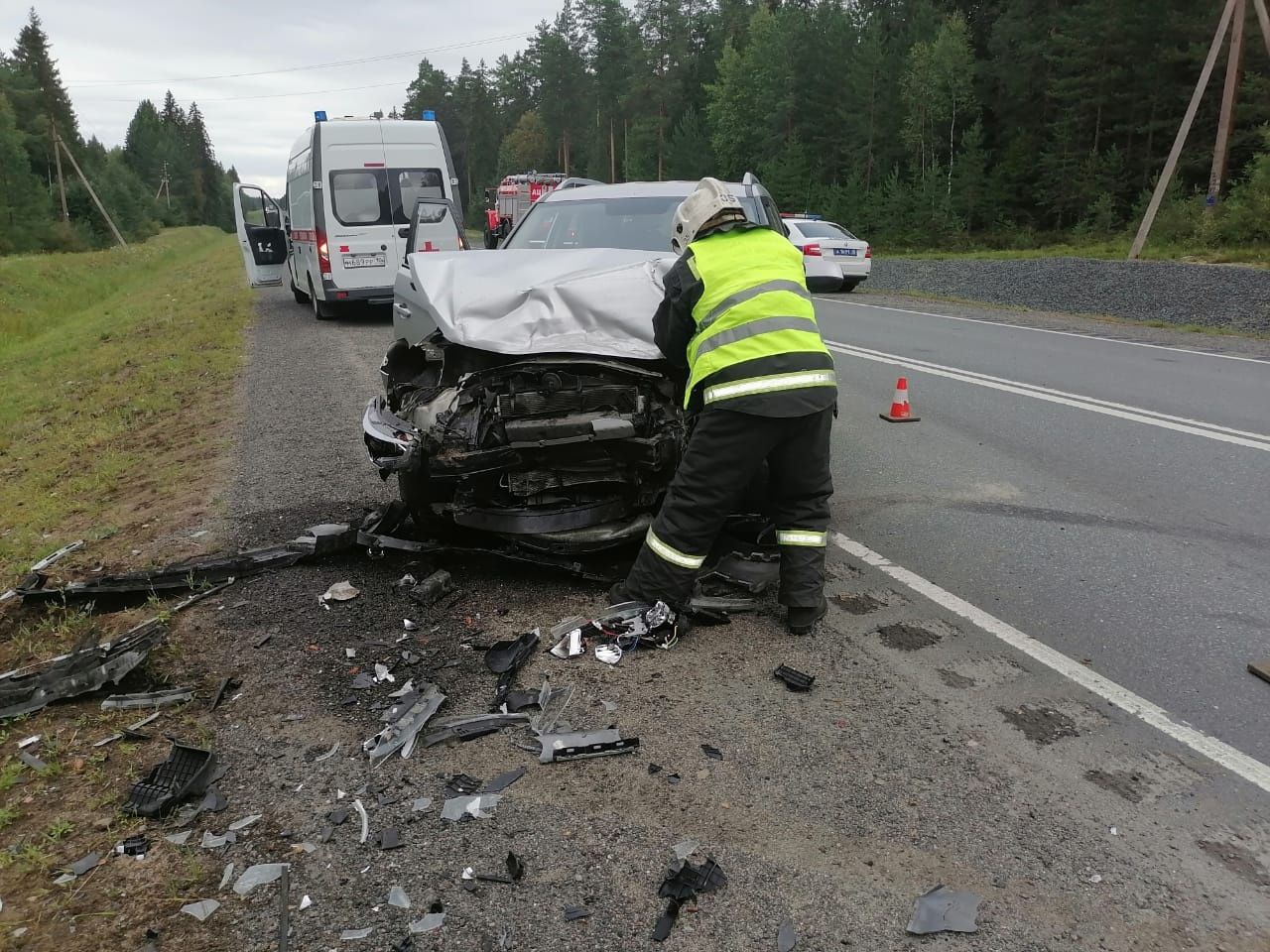 Спасателям сообщили о происшествии в 16:58. На 298-м километре трассы «Кола» столкнулись три транспортных средства. На место для помощи с ликвидацией послледствий ДТП выехали спасатели пожарной части города Олонец.