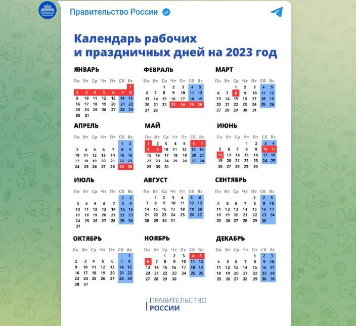 Кабмин России утвердил график праздничных и выходных дней в 2023-м году. Его опубликовали в Telegram-канале правительства.