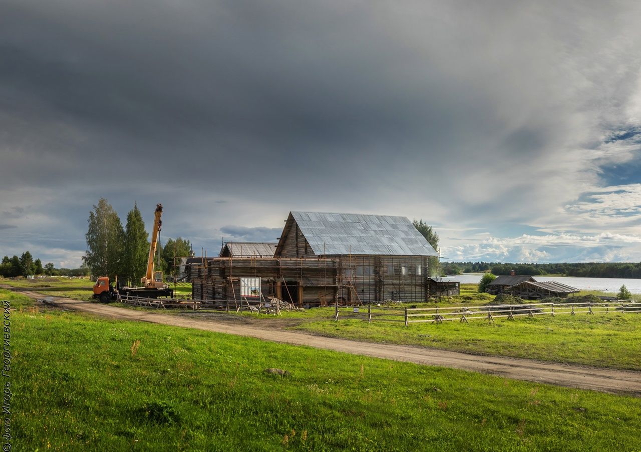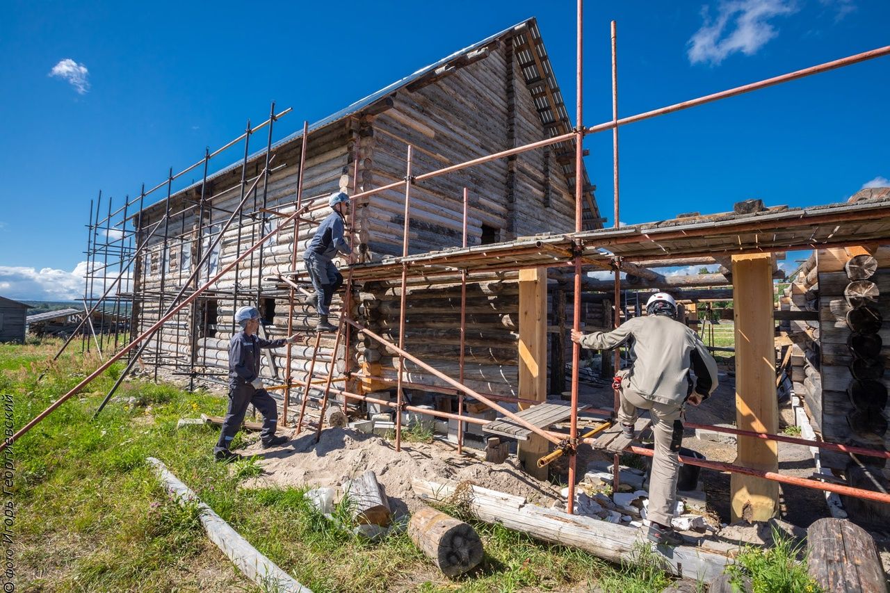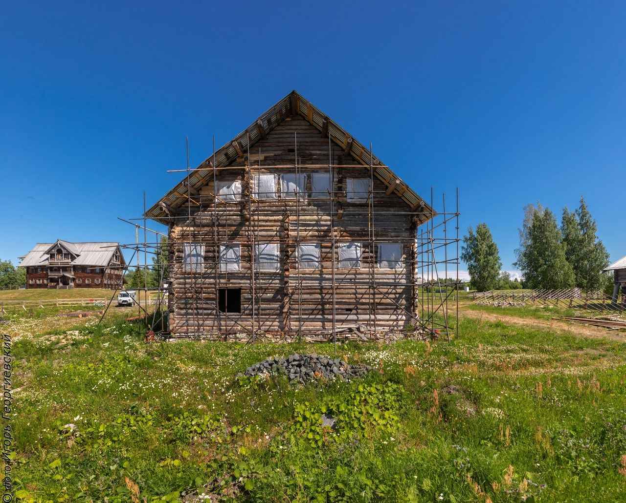 Реставрация дома Сергеевой в деревне Васильево острова Кижи завершается. Жилая часть уже собрана и находится под страховочной кровлей, сейчас идет сборка хозяйственной части.