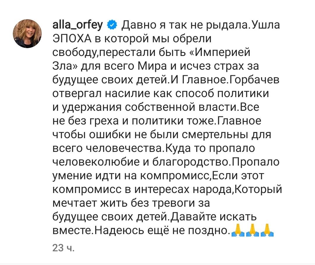 Алла Пугачева, которая присутствовала на прощании с Михаилом Горбачевым, опубликовала пост в запрещенной в России социальной сети: