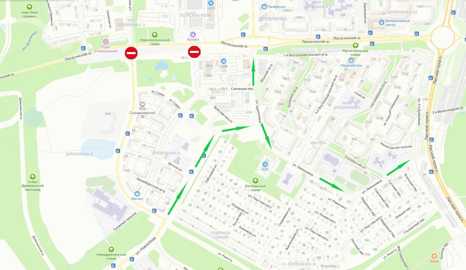 На следующей неделе изменится схема движения транспорта на Древлянке. Связано это с переустройством коммуникаций при продлении Лососинского шоссе.