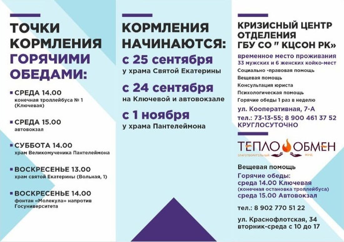 Волонтеры Социального центра «Попечение» совместно с Благотворительным фондом «Теплообмен» подготовили брошюры с полезной информацией для бездомных с адресами и графиком кормления. Сейчас в городе пять таких точек.