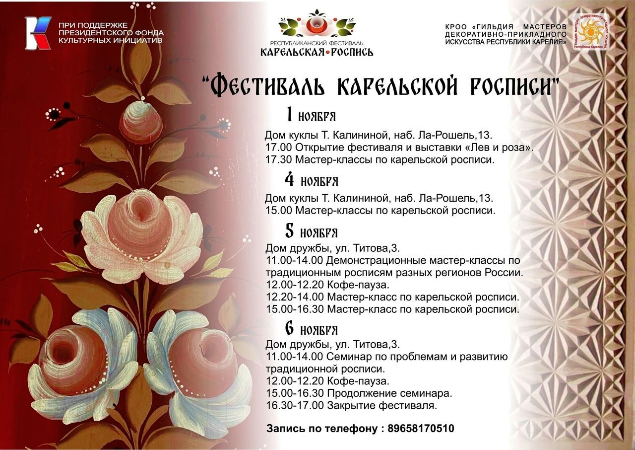 Откроет его выставка «Лев и роза» в художественной галерее «Дом Куклы» имени Татьяны Калининой. Свои работы представят 50 авторов – профессионалы, работавшие на легендарном комбинате «Карельские сувениры», мастера-любители, а также участники проекта, окончившие курсы карельской росписи, организованные Гильдией мастеров декоративно-прикладного искусства Республики Карелия.