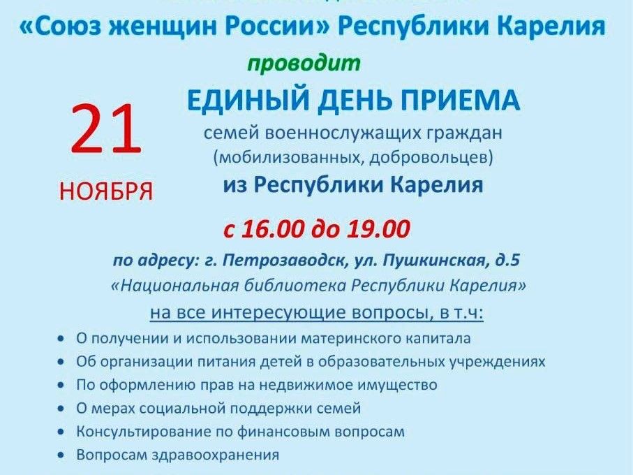 21 ноября состоится единый день приема семей военнослужащих граждан, мобилизованных и добровольцев, из Карелии. Организованы встречи будут в Петрозаводске и в 15 районах Карелии, сообщают в правительстве республики.