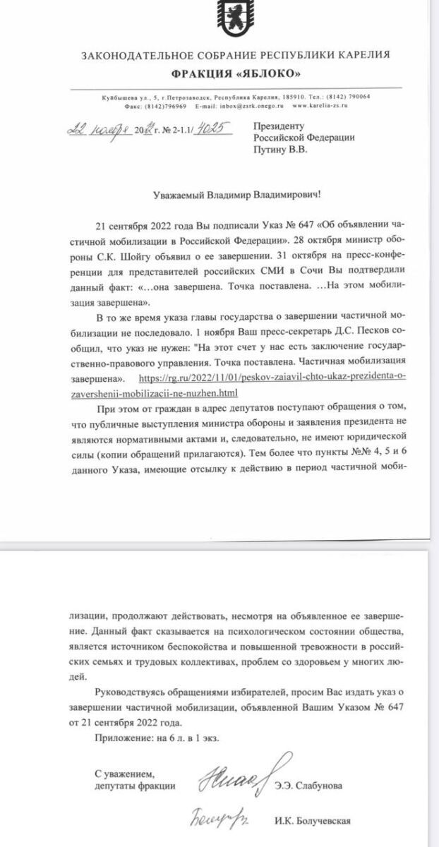 Депутаты фракции «Яблоко» в Заксобрании Карелии направили письмо на имя президента. Эмилия Слабунова и Инна Болучевская отметили, что официальными лицами были сделаны заявления об окончании призыва по частичной мобилизации, однако соответствующий указ до сих пор не издан.