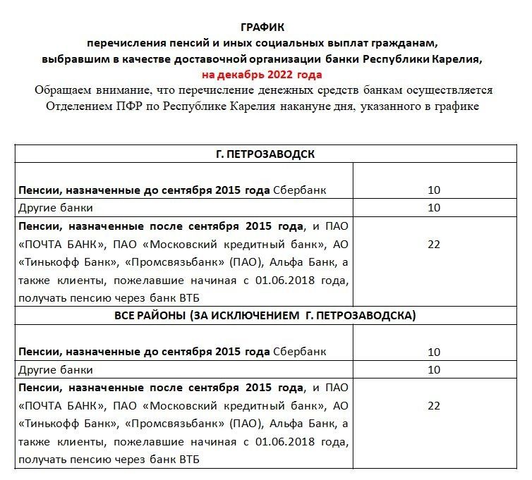 Карельское отделение Пенсионного фонда опубликовало график перечисления пенсий и социальных выплат в декабре.