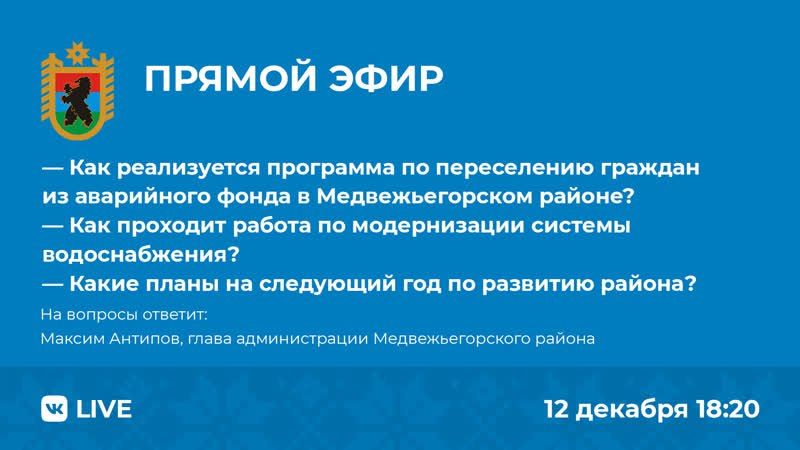 В рамках проекта «ЦУР Объясняет» в понедельник, 12 декабря, в прямом эфире на вопросы жителей о том, как реализуется программа по переселению граждан из аварийного фонда, проходит работа по модернизации системы водоснабжения и планах на следующий год по развитию Медвежьегорского района ответит глава муниципалитета Максим Антипов.