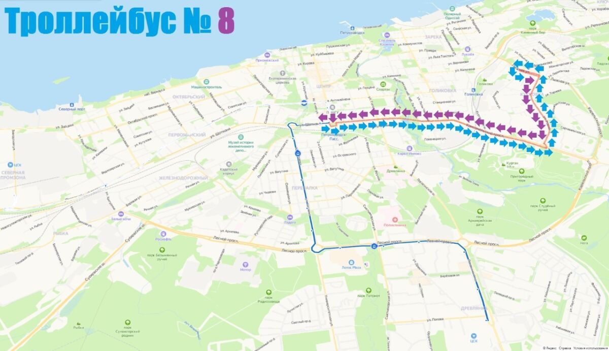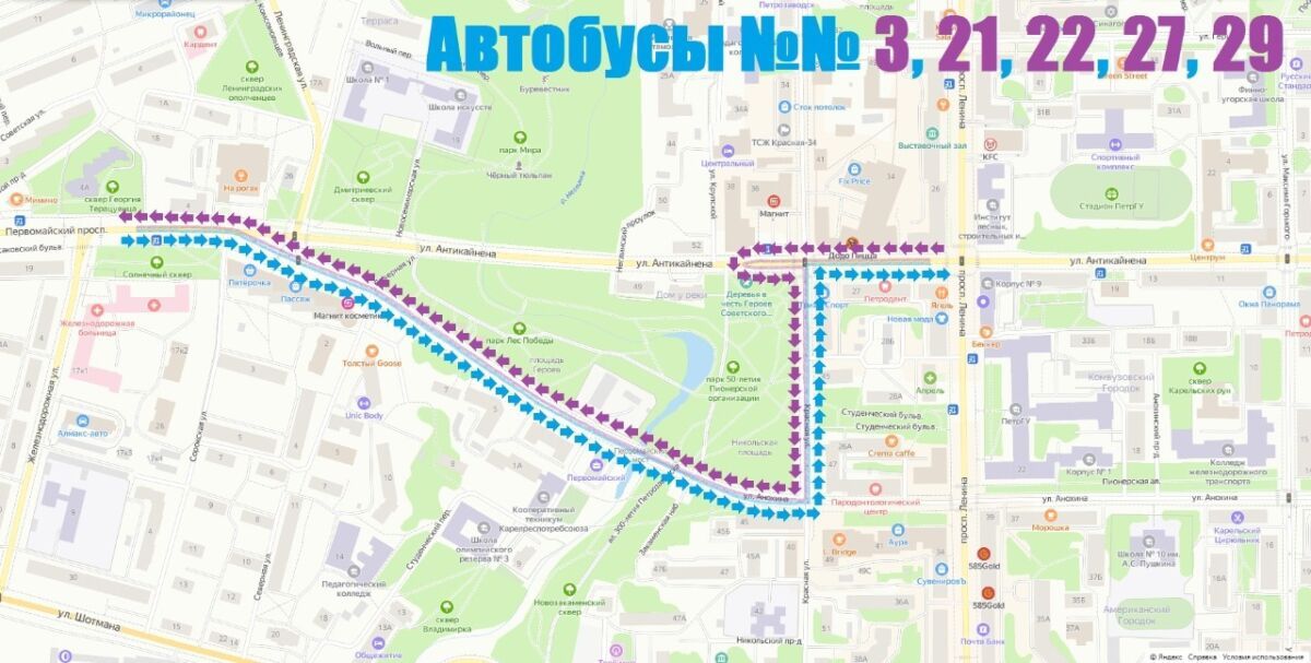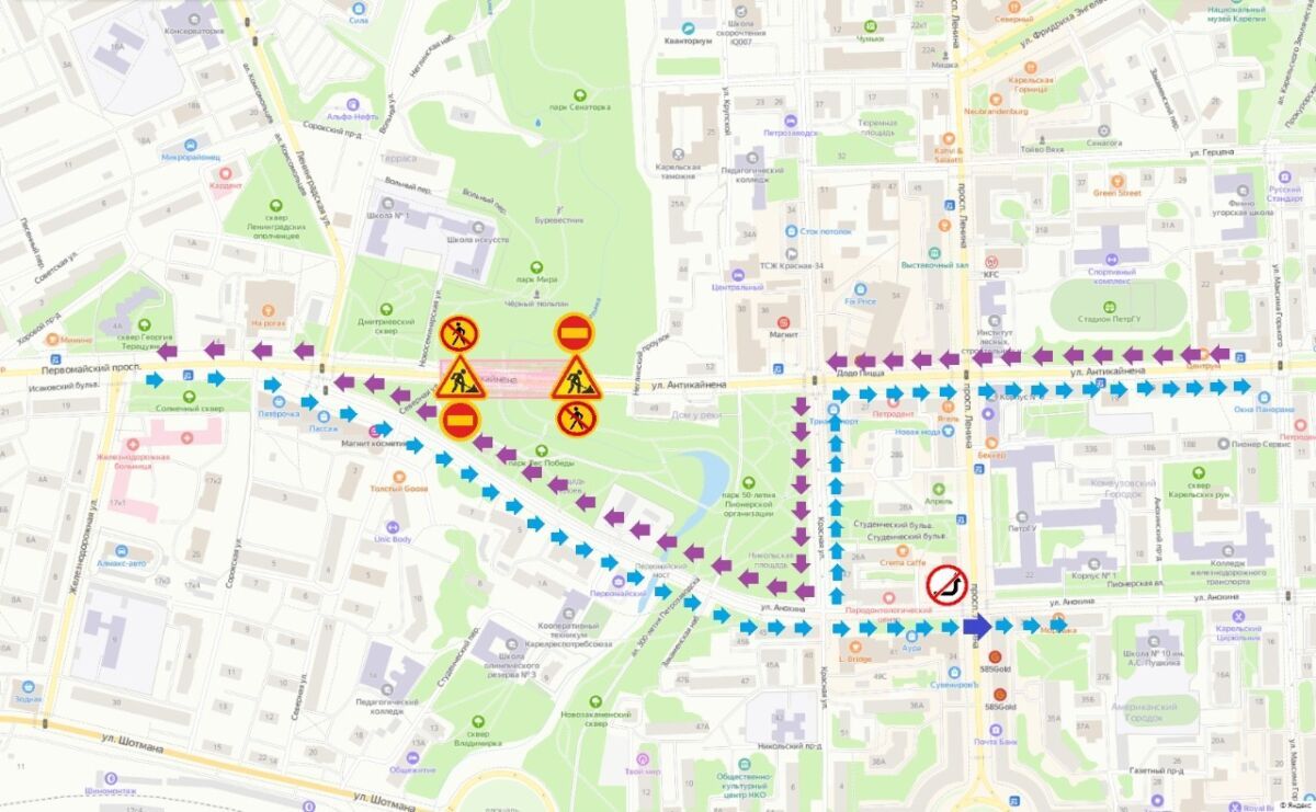 — прямое направление (с Древлянки-8): по существующему маршруту до остановки «Центральный рынок» – разворот на Красную улицу – правый поворот на улицу Анохина – на перекрестке улиц Антикайнена и Ленинградской поворот налево на Первомайский проспект – далее без изменений;