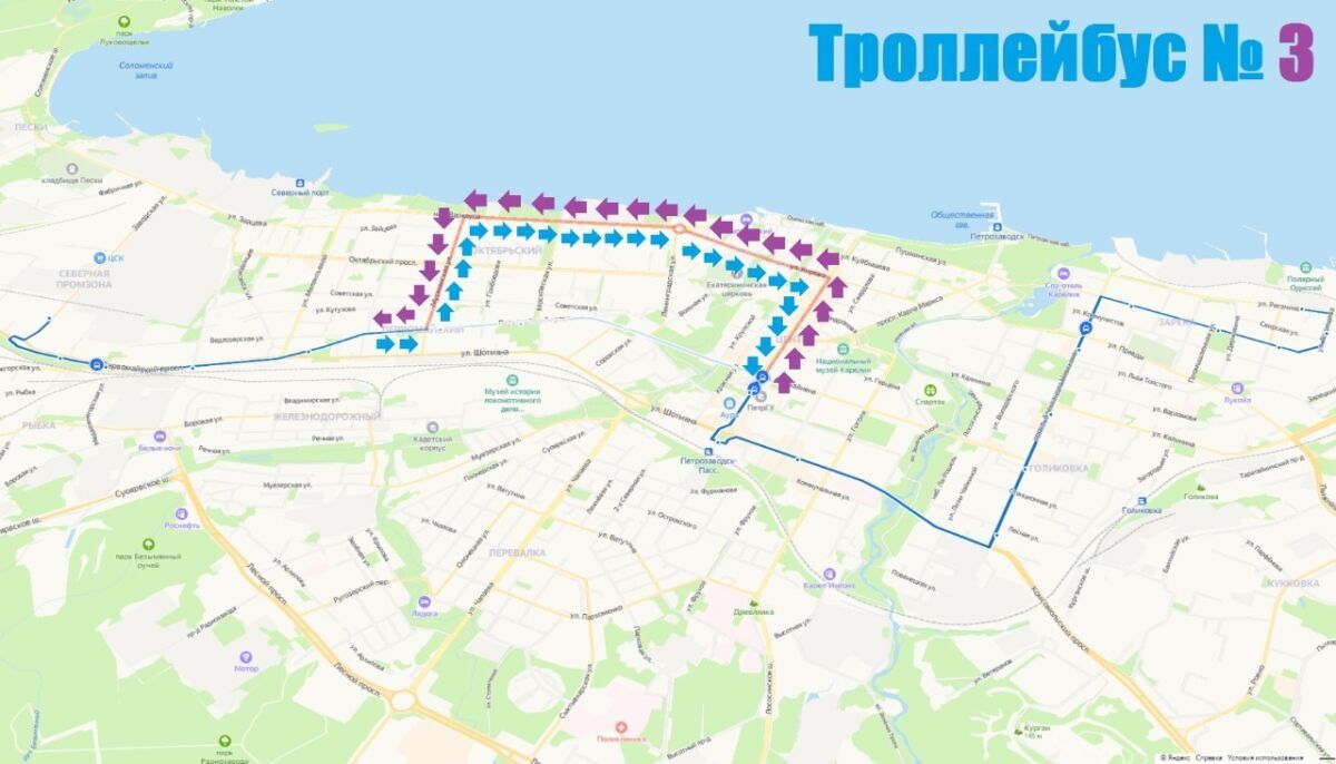 — конечная станция «Лыжная ул.» – улица Ровио – Комсомольский проспект – Красноармейская улица – площадь Гагарина – проспект Ленина – улица Кирова – набережная Варкауса – улица Мелентьевой – улица Зайцева – конечная станция «ДСК» – улица Зайцева – улица Мелентьевой – набережная Варкауса – улица Кирова – проспект Ленина – площадь Гагарина – Красноармейская улица – Комсомольский проспект – улица Ровио – Лыжная улица – конечная станция «Лыжная ул.»;