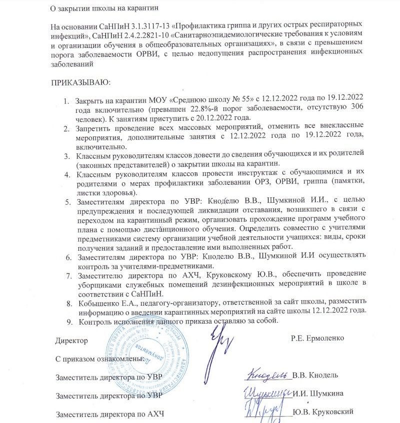 Согласно приказу директора Риммы Ермоленко, школу закрыли на карантин с 12 по 19 декабря. Все массовые и внеклассные мероприятия отменили на тот же срок.