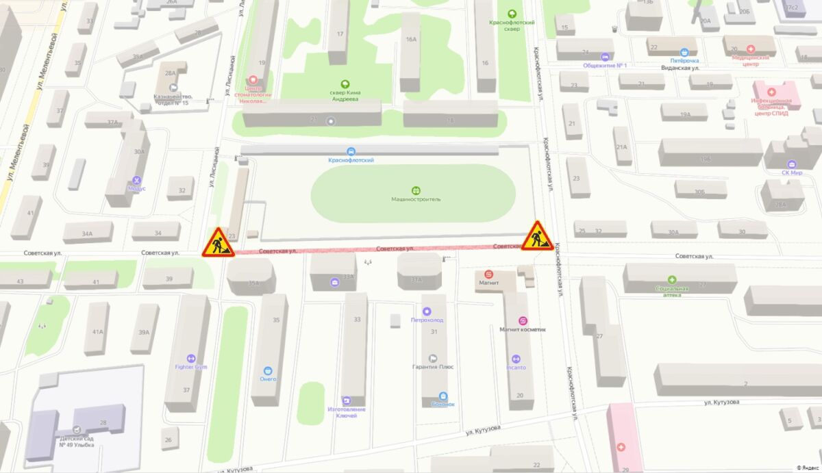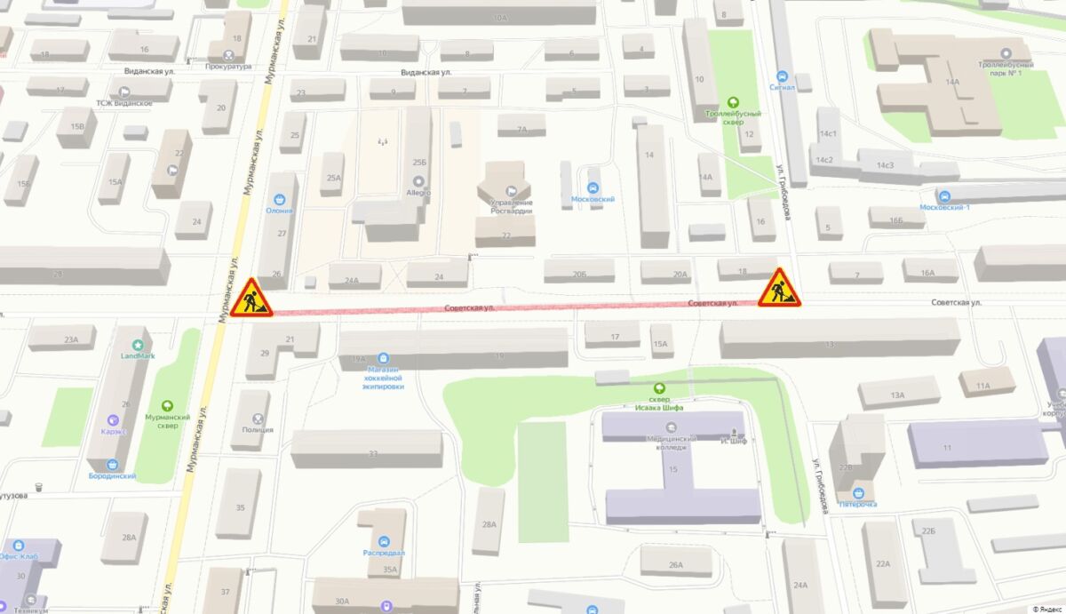 В начале следующего года закроют проезд по Советской улице. С 9 января по 28 февраля проезд будет закрыт на участке между улицами Лисицыной и Краснофлотской, с 9 января по 26 марта – между улицами Мелентьевой и Лисицыной, с 28 февраля по 15 апреля – между улицами Грибоедова и Мурманской.