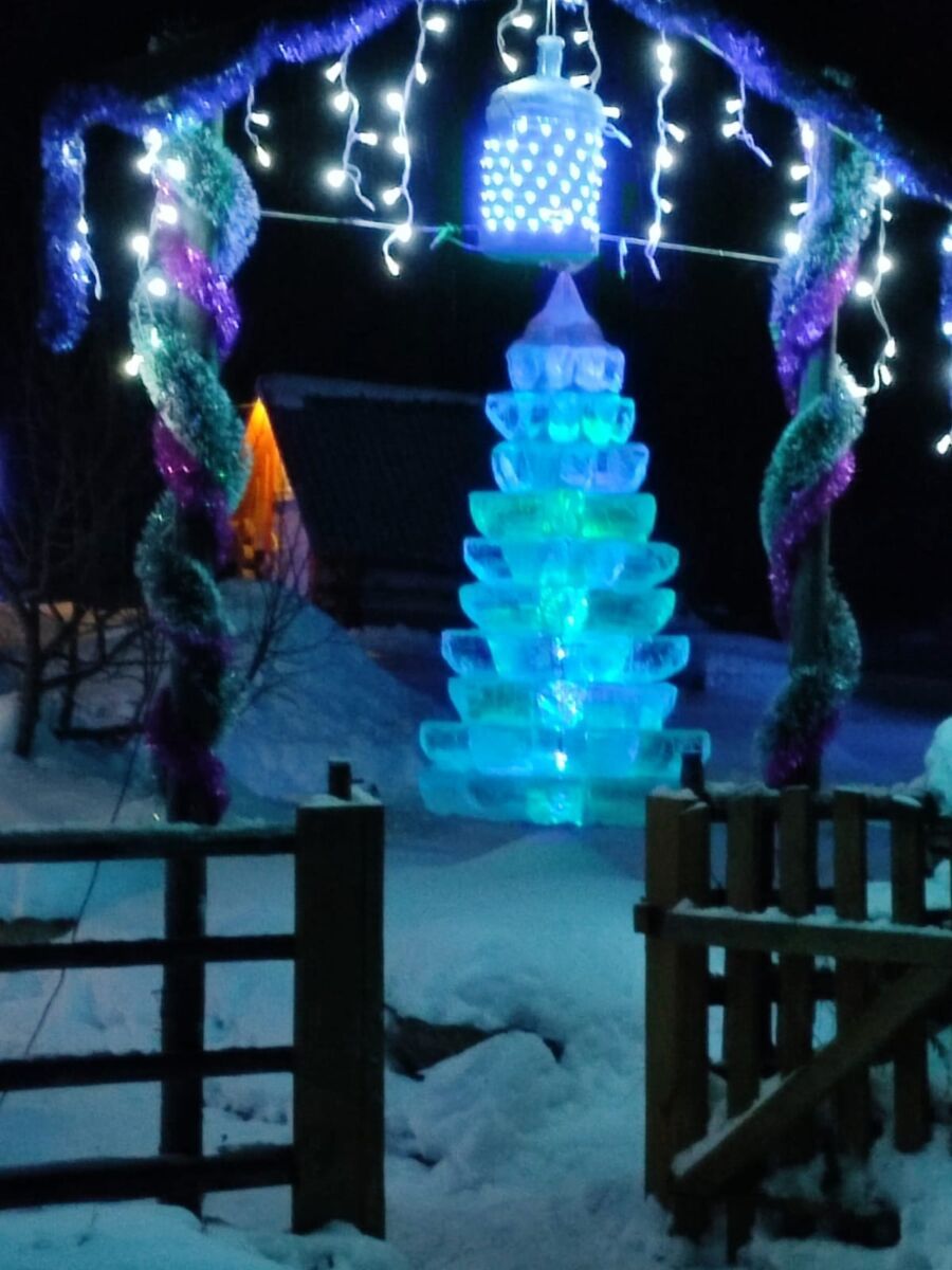 Ледяная ель, гирлянды, надпись «2023». Люди хотят праздника и создают его себе сами. Молодцы!
