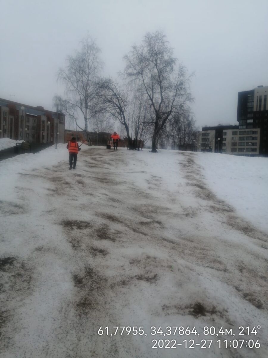 Накатанный склон на пересечении проспекта Александра Невского и улицы Калинина в Петрозаводске засыпали песком.