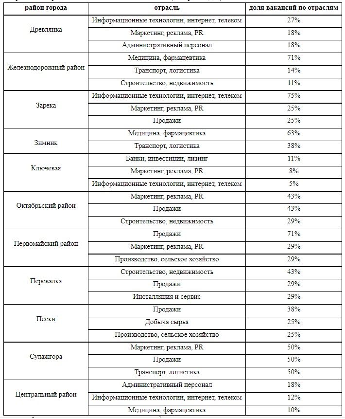 Специалисты выяснили, в каких микрорайонах новые предложения появляются чаще чаще. Ождаемо на первом месте оказался Центр, где открыто 72% новых вакансий за последнее время от общего числа вакансий в городе. Меньше всего новых вакансий разместили работодатели из Октябрьского, Первомайского районов и с Зареки (по 1% вакансий).