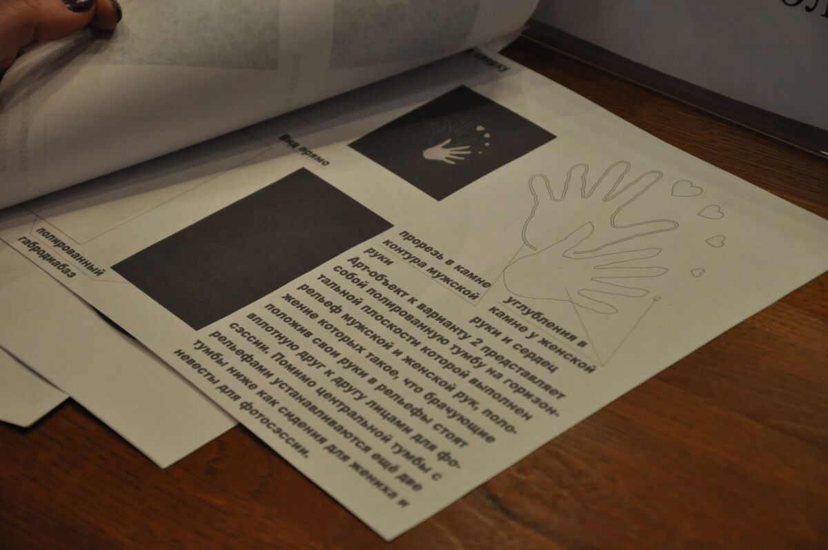 Материал пока не определен, но, думаю, можно было бы использовать мрамор – для мужской руки темный, для женской – светлый. Если молодожены приложат свои ладони к выгравированным, они будут стоять друг к другу лицами – должен получиться хороший кадр, – написал Любарский.
