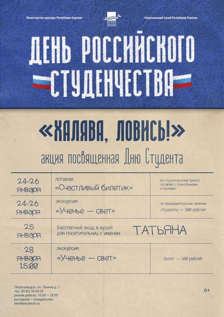 В Национальном музее Карелии с 24 по 26 января проводятся мероприятия, приуроченные к Дню студента. Здесь проходит акция «Халява, ловись!» (6+). Посетителям рассказывают об истории образования, предложат поучаствовать в праздничной лотерее. Об этом сообщили в Минкульте Карелии.